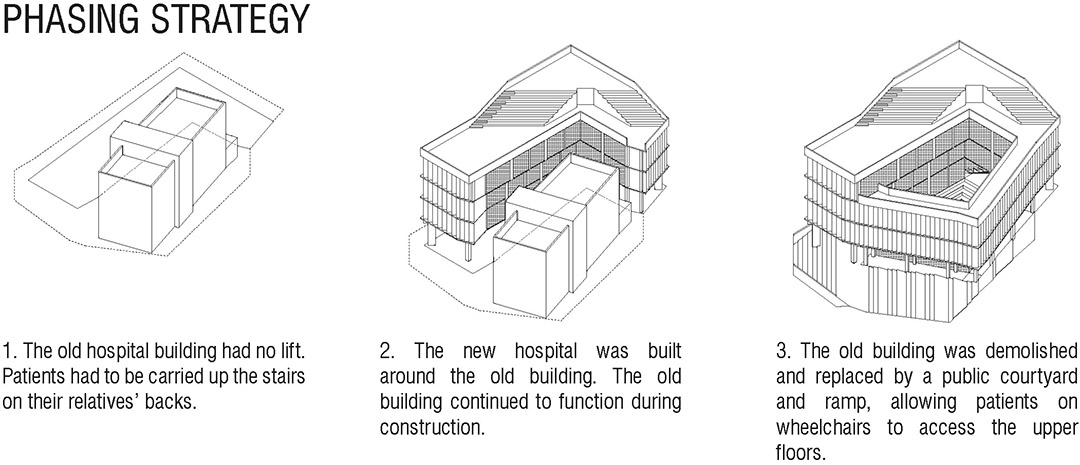 此项目针对农村地区的医院设计与管理。建筑师与慈善机构和政府紧密合作,把一个医院的功能重新组织和分布。设计策略简单直接,利用坡道为所有楼层提供无障碍通道。这样,坡道与大楼中间形成了一个中央庭院,作为公共开放场域。材料使用包括再用砖和定制的混凝土镂空砌块。