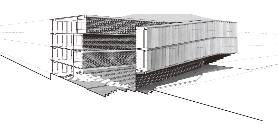 The program of a hospital is re-configured from its conventional form. The design begins with a simple strategy to provide a continuous ramp access to all floors. A wide ramp allows for seating and improves circulation. This also creates a large central courtyard space open for public use.