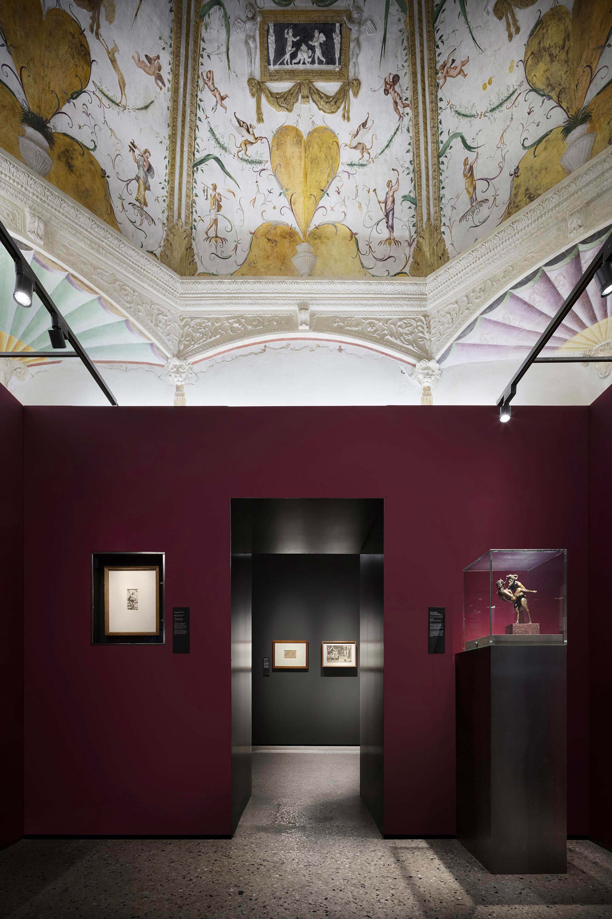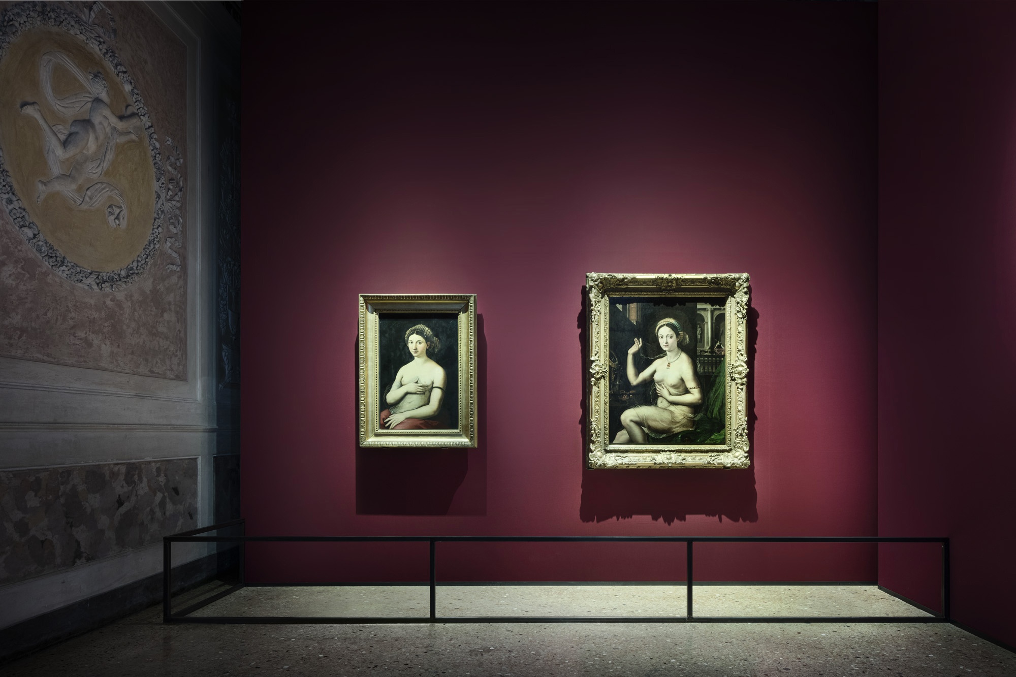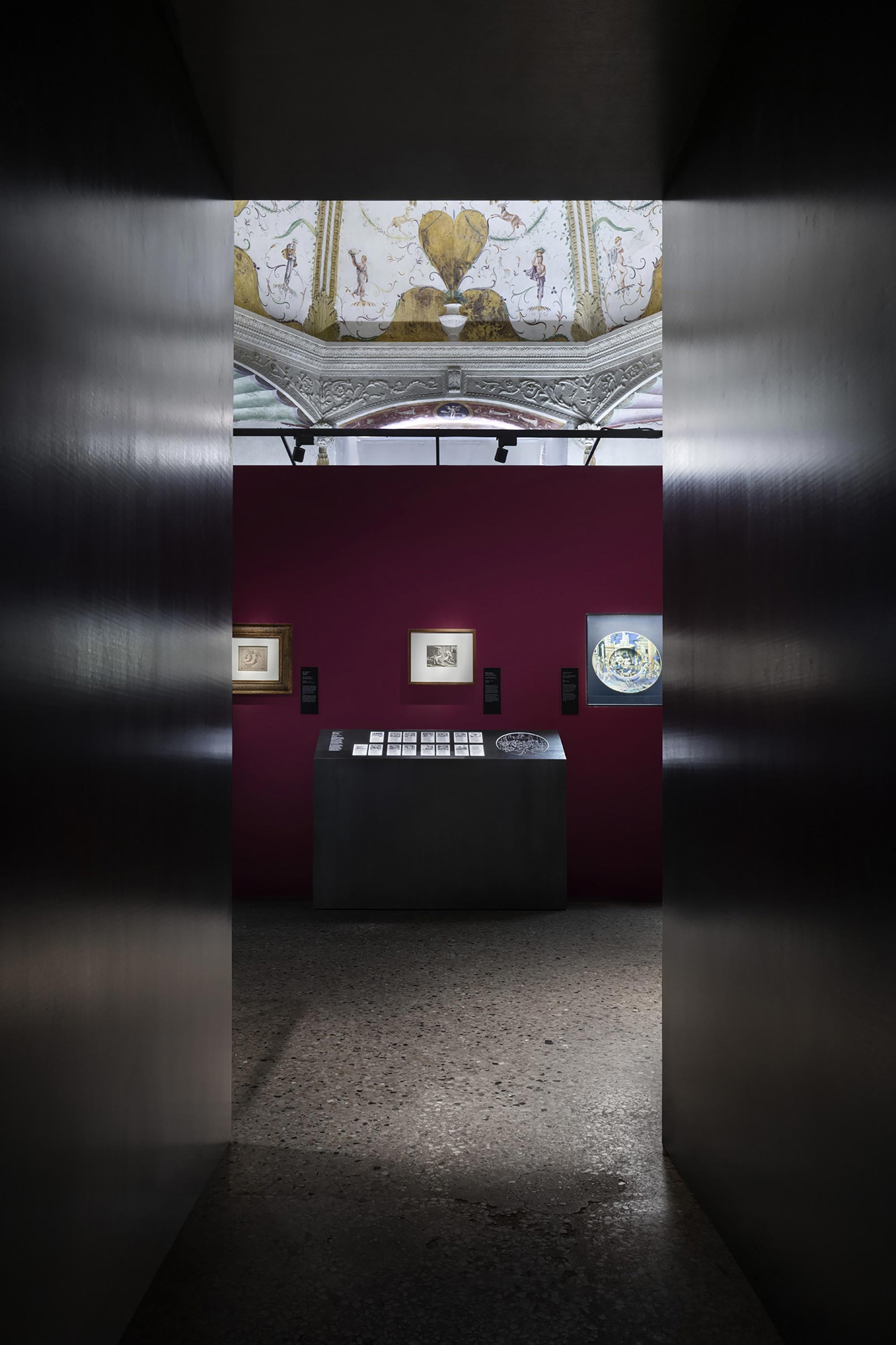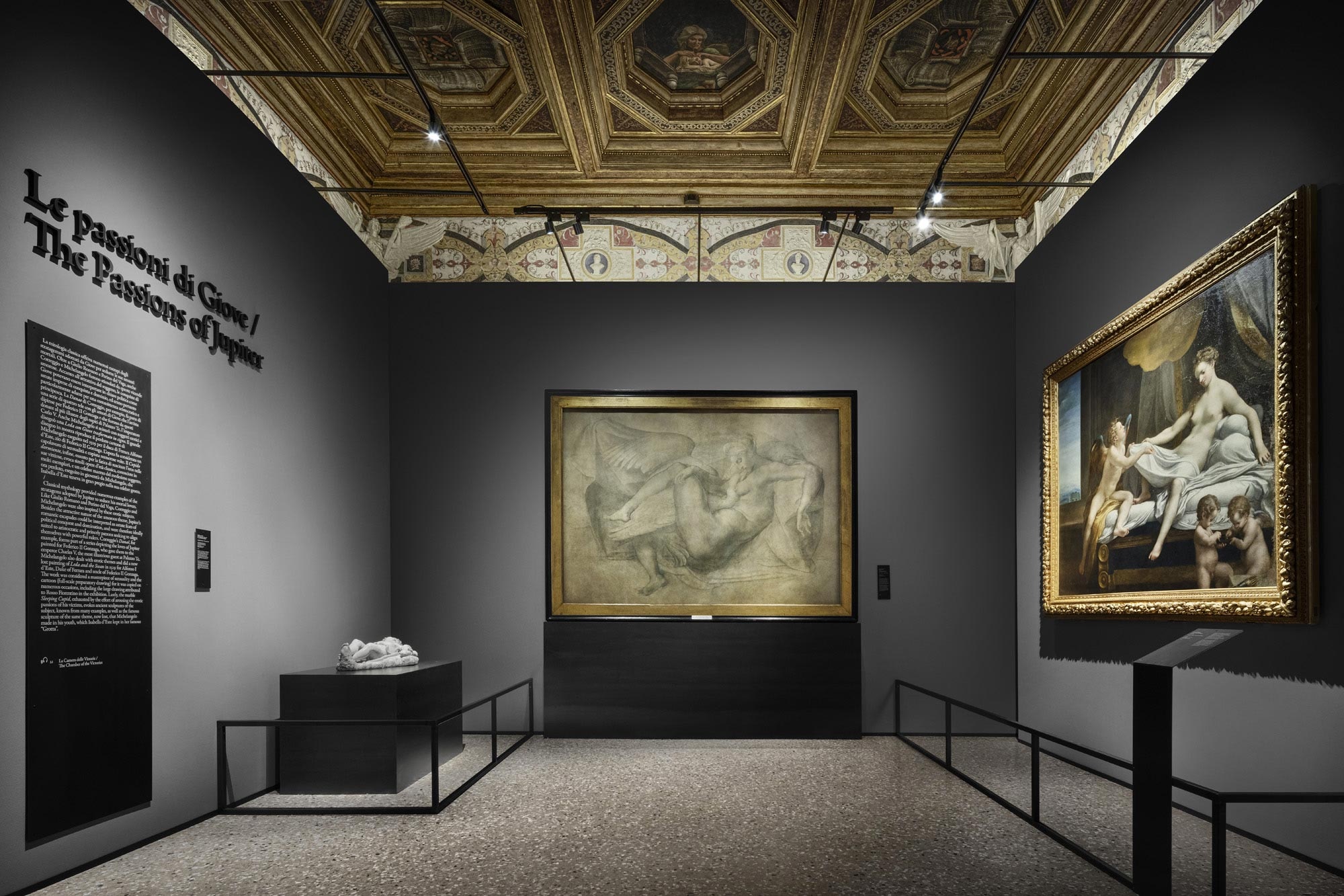 The narrative of the exhibition takes place against a neutral, pearl grey background directing at supporting the “metallic” nature of Giulio Romano’s paintings, to use the definition proposed by certain scholars. At the same time, a “sensuous” red highlights the more audacious portrayals of eroticism in the “Camerino dei Modi” and in the room dedicated to portraits of the female nude. At the same time, the design of the exhibition integrates into the architecture of Palazzo Te, respecting the space it inhabits and allowing the magnificence of Giulio Romano’s masterpiece, his frescoes and his architectonic decorations to receive full expression.