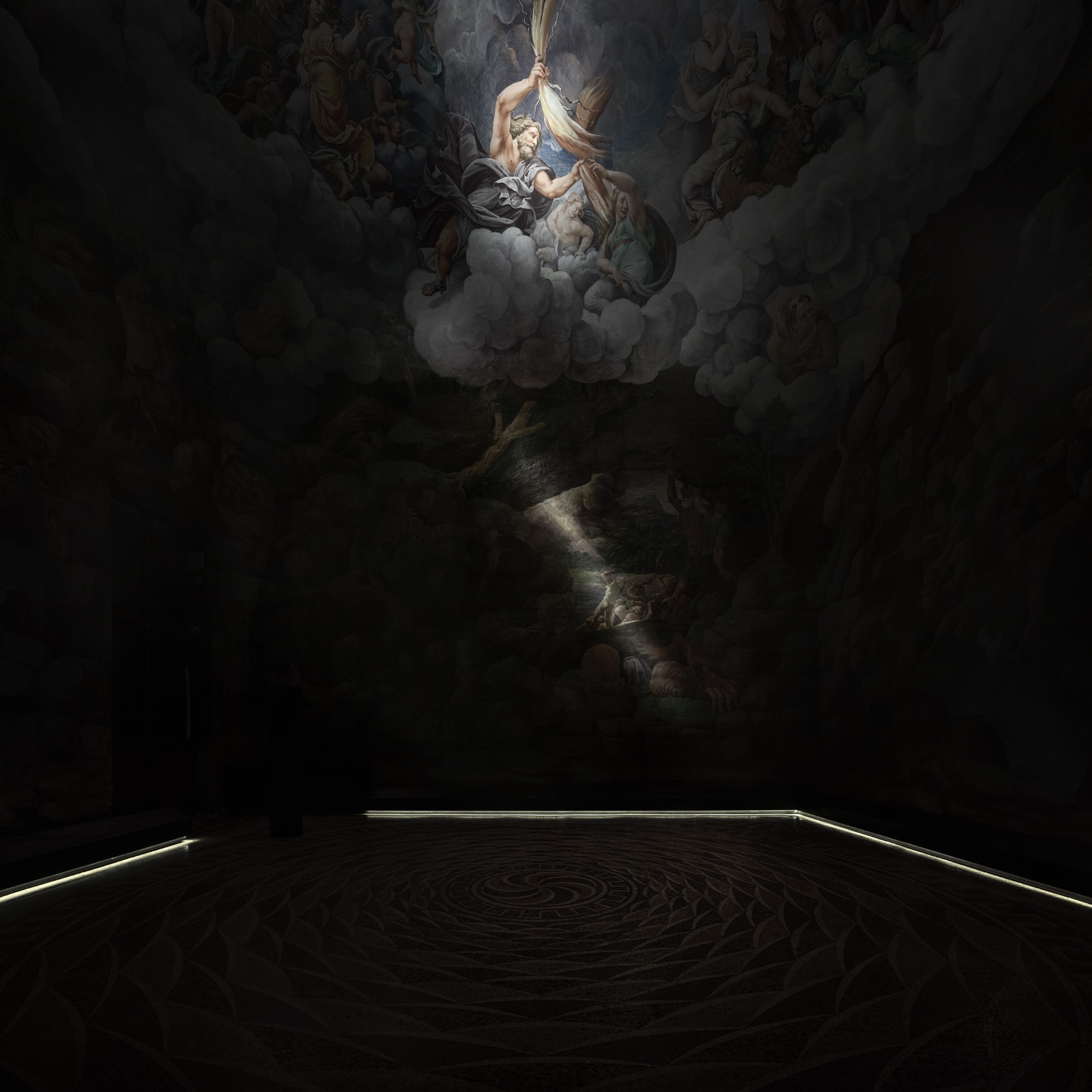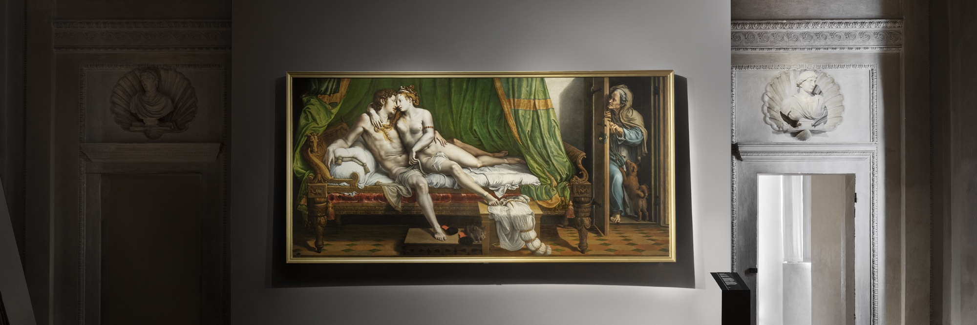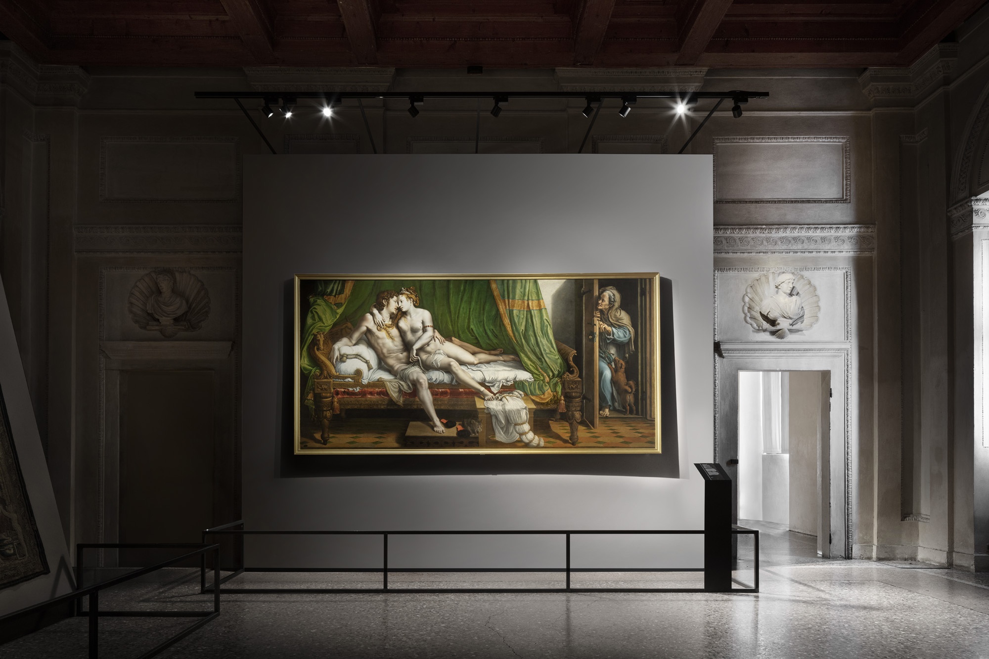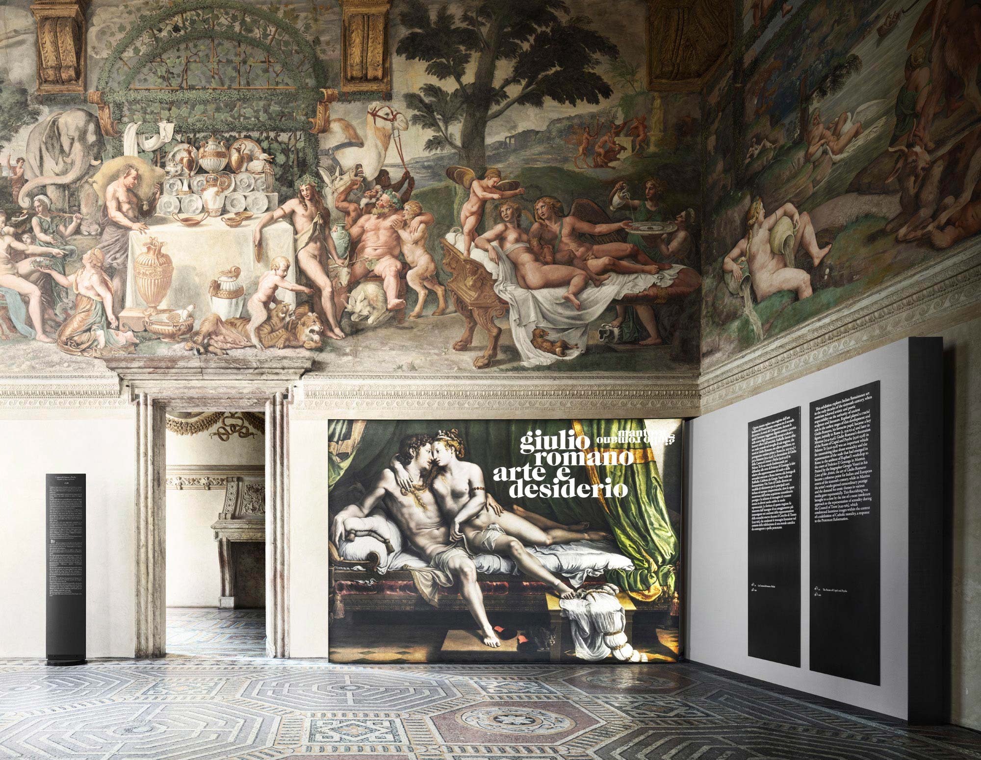 The narrative of the exhibition takes place against a neutral, pearl grey background directing at supporting the “metallic” nature of Giulio Romano’s paintings, to use the definition proposed by certain scholars. At the same time, a “sensuous” red highlights the more audacious portrayals of eroticism in the “Camerino dei Modi” and in the room dedicated to portraits of the female nude. At the same time, the design of the exhibition integrates into the architecture of Palazzo Te, respecting the space it inhabits and allowing the magnificence of Giulio Romano’s masterpiece, his frescoes and his architectonic decorations to receive full expression.