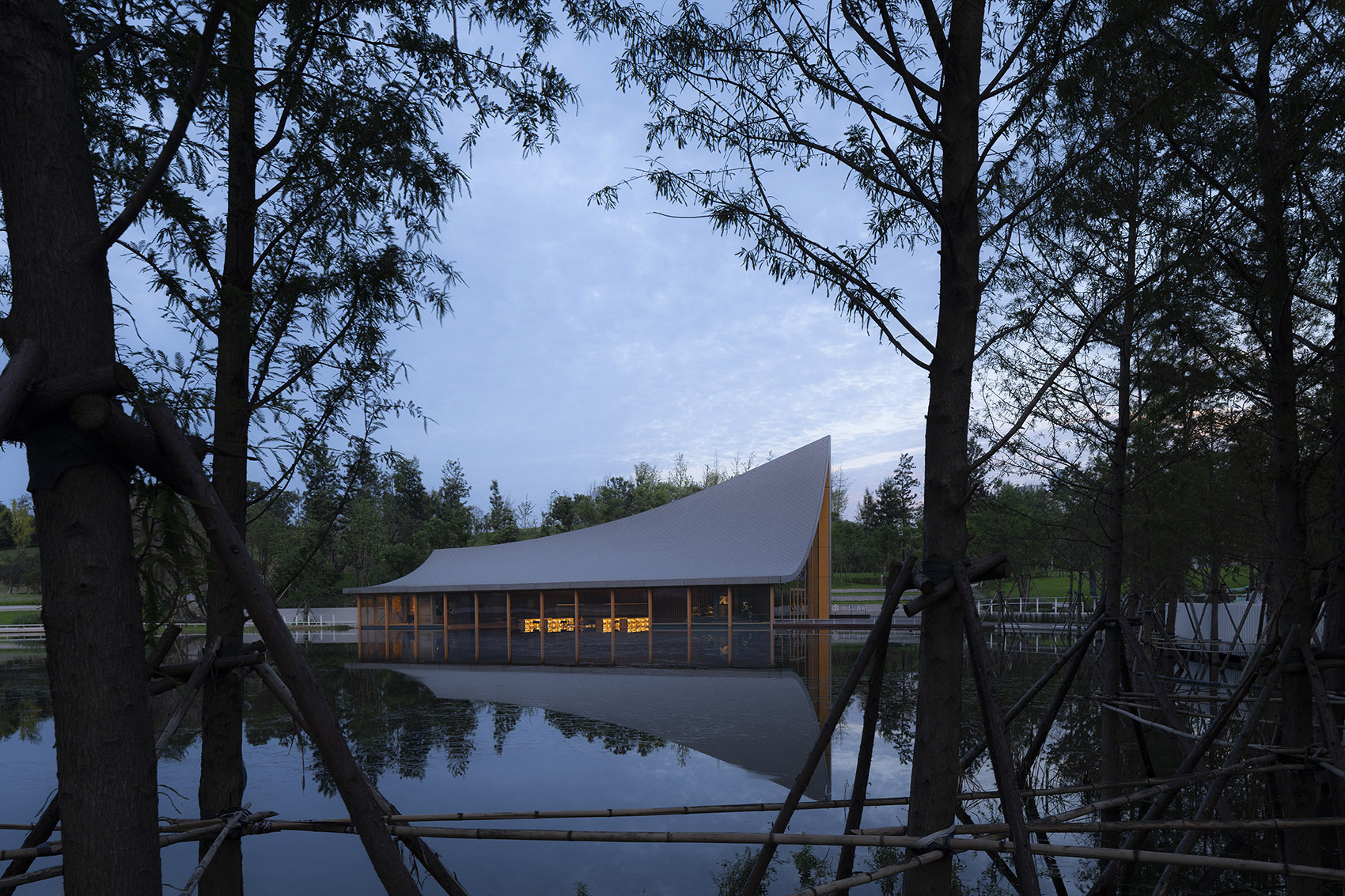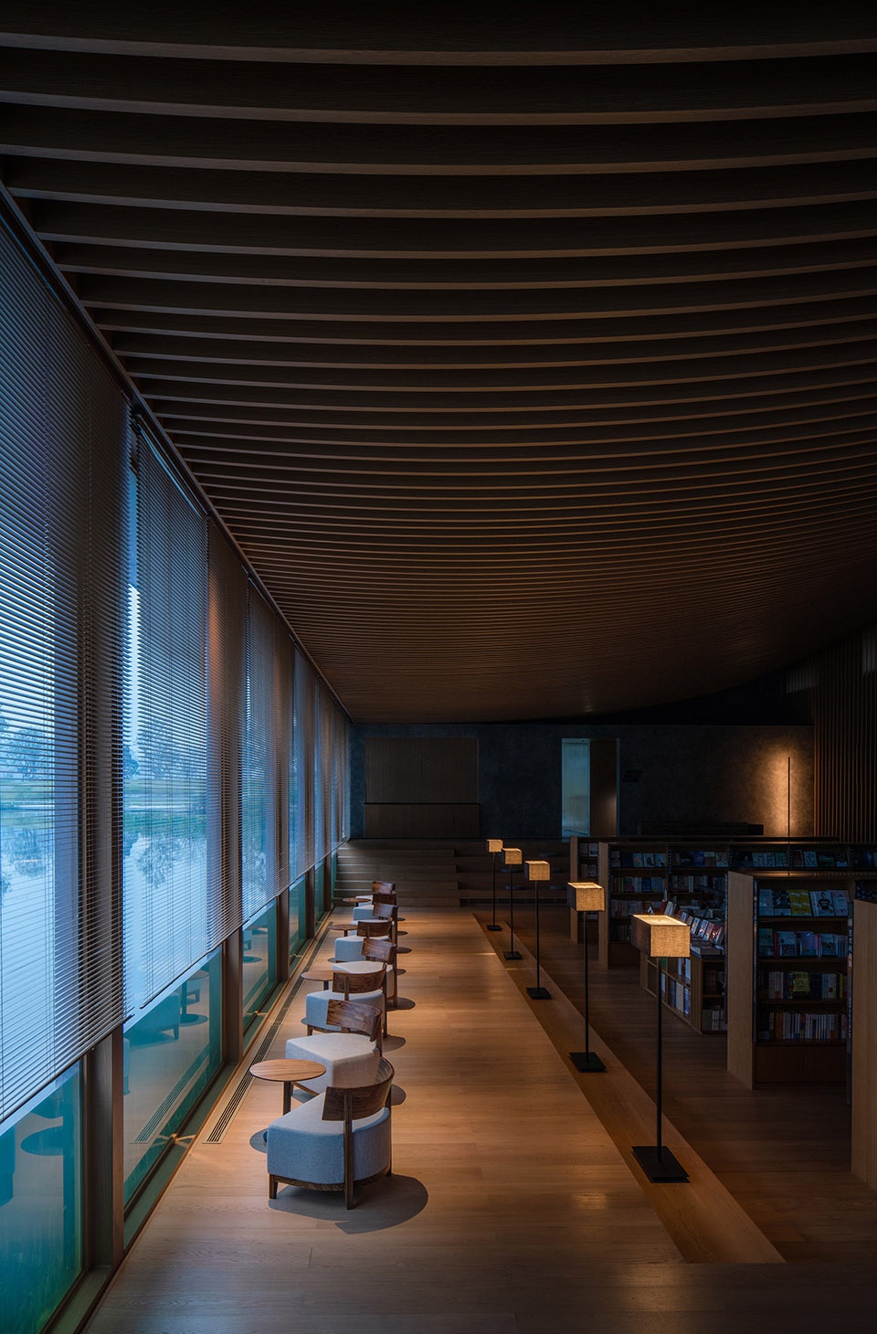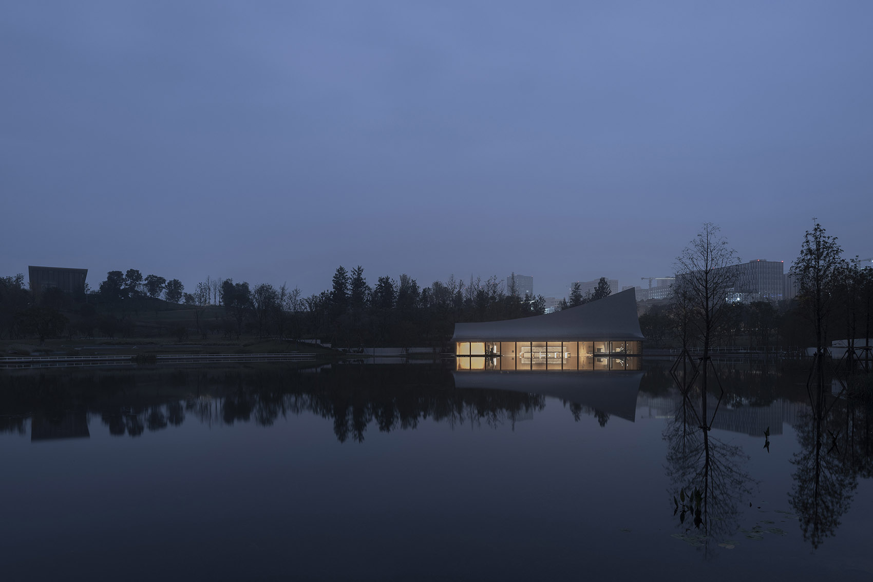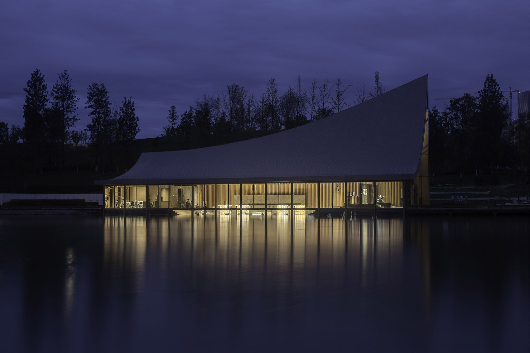 Two ends of the roof ridge are vertically stretched from 3 meters to different heights where the southwest end is elevated to 16 meters and the northeast end stops at 7.5 meters. The curved roof surface is formed according to the height of four supporting corners as a flipped page, which reinterprets the pitched roof of traditional Sichuan folk dwellings. Meanwhile, the roof also cooperates with the water ripples in order to extend the wavy feature to the architecture and blend in the natural environment. The architecture is linearly expanded to conform with the site and connect with the lake. The glass curtain wall is installed to be partially subaqueous as the waterfront façade of the bookstore. The natural light penetrates through the water and streams into the interior space of the bookstore, which assists in creating an ambience of serenity.