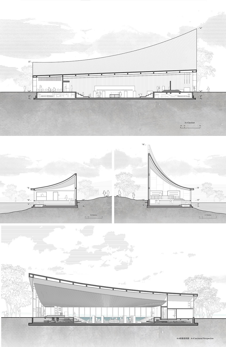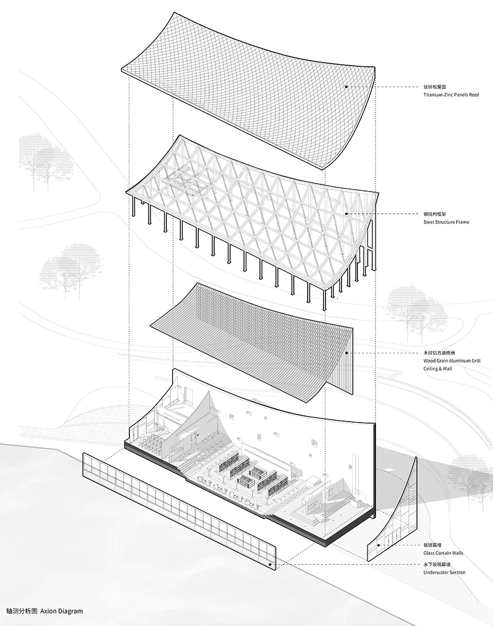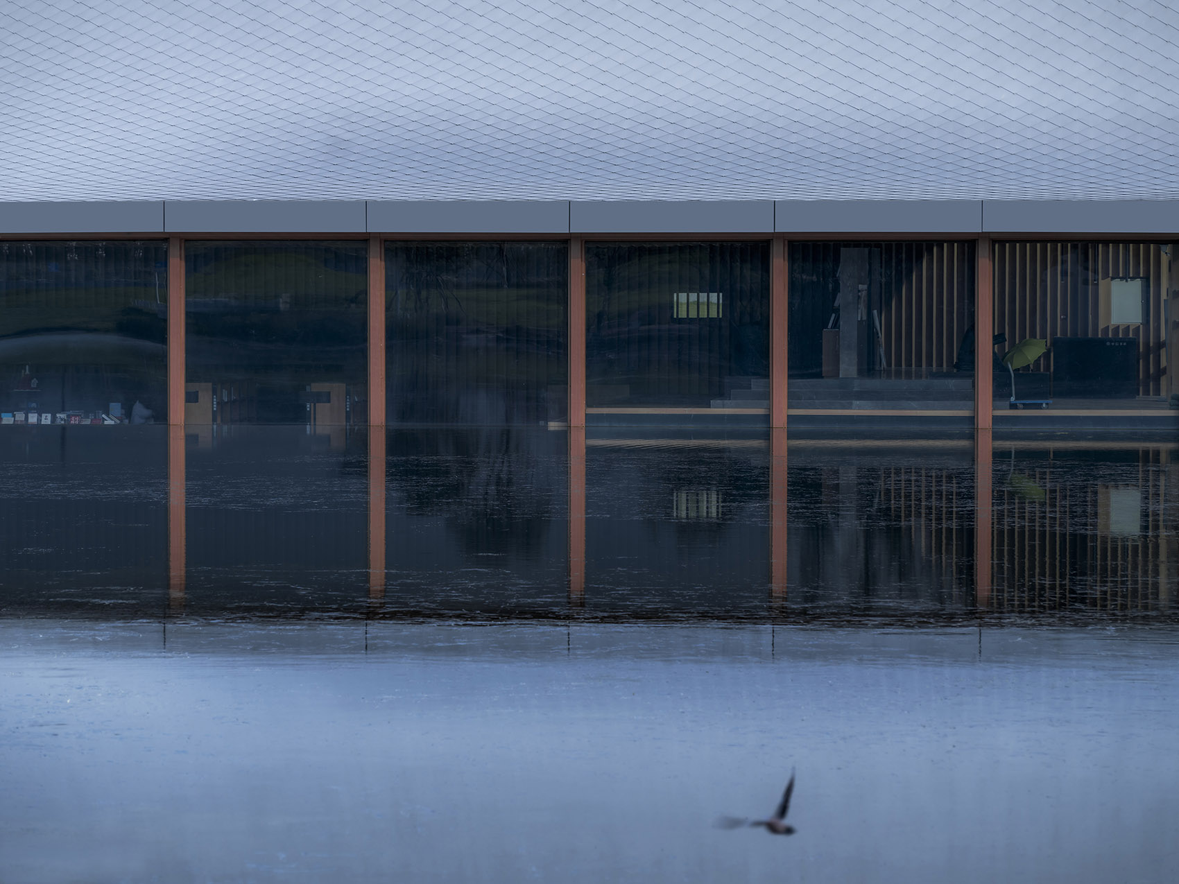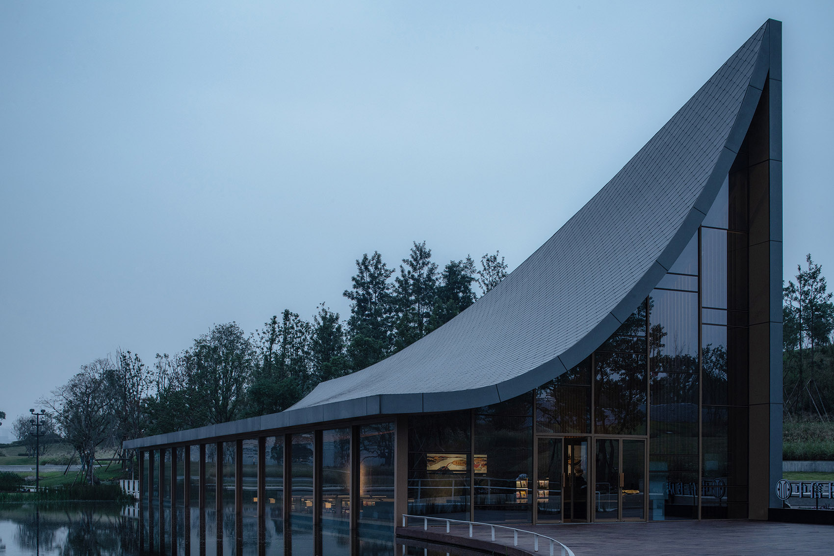 Two ends of the roof ridge are vertically stretched from 3 meters to different heights where the southwest end is elevated to 16 meters and the northeast end stops at 7.5 meters. The curved roof surface is formed according to the height of four supporting corners as a flipped page, which reinterprets the pitched roof of traditional Sichuan folk dwellings. Meanwhile, the roof also cooperates with the water ripples in order to extend the wavy feature to the architecture and blend in the natural environment. The architecture is linearly expanded to conform with the site and connect with the lake. The glass curtain wall is installed to be partially subaqueous as the waterfront façade of the bookstore. The natural light penetrates through the water and streams into the interior space of the bookstore, which assists in creating an ambience of serenity.