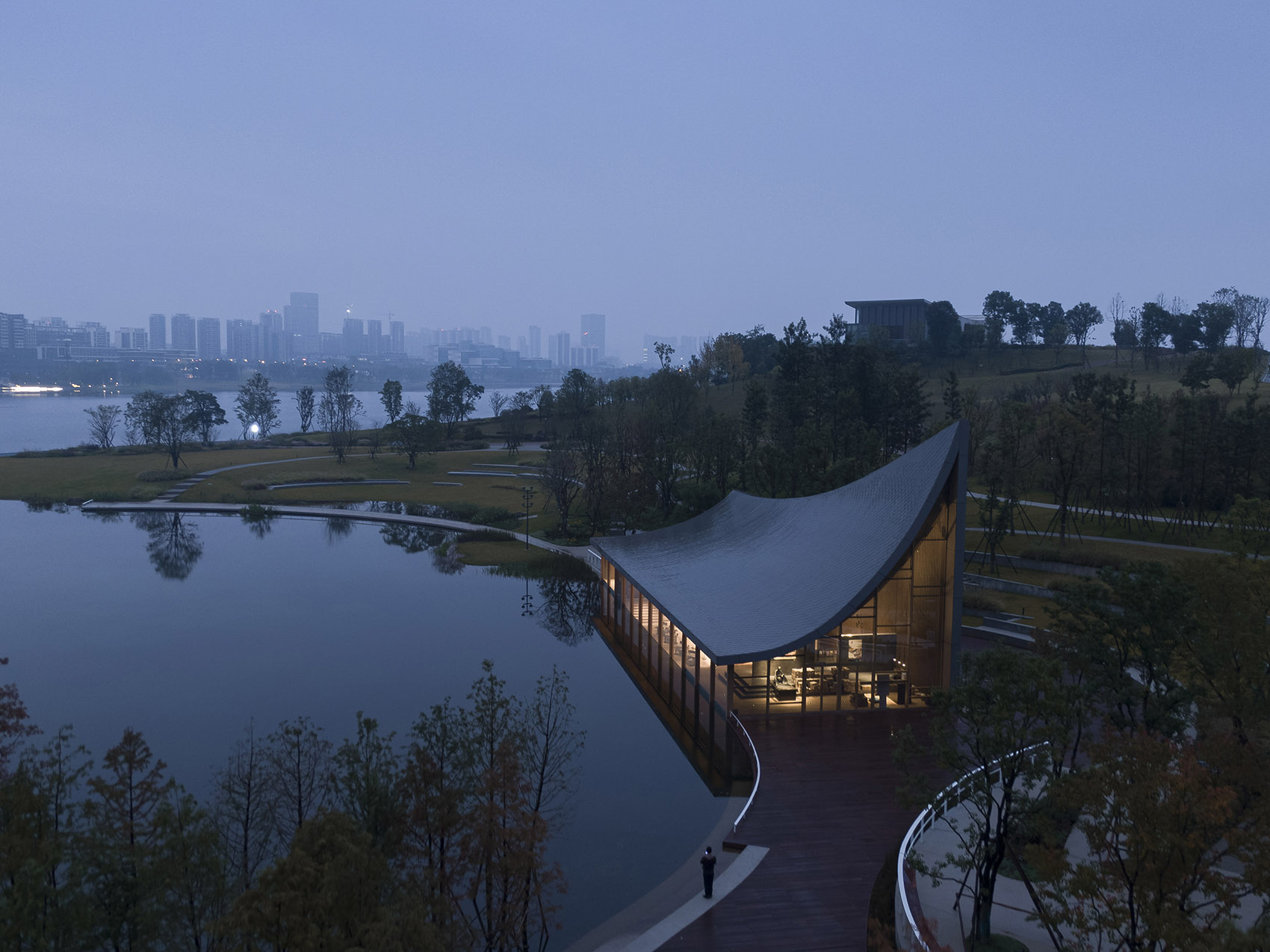 MUDA慕达建筑以此为契机,希望通过此次湖畔书店设计,反映出成都特有的城市气质和生活方式,并最大程度地尊重兴隆湖的自然环境,绘制出“山水相融、城境共生”的生态蓝图。