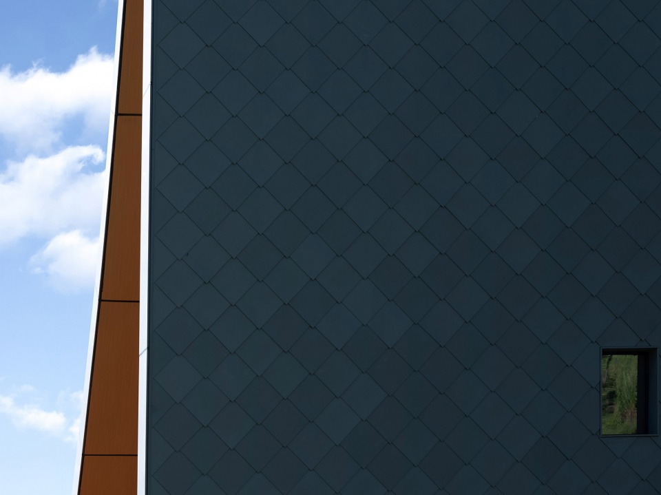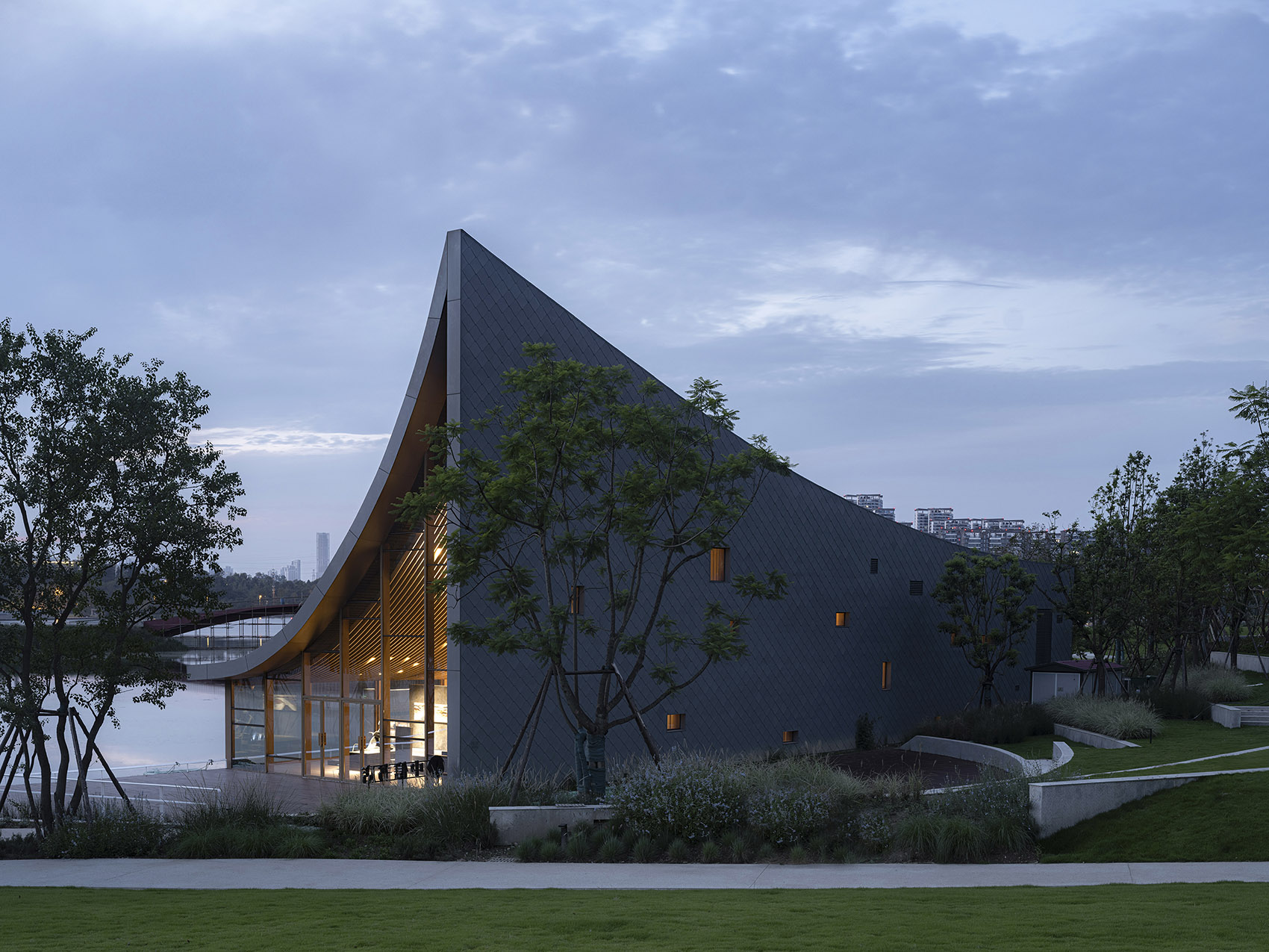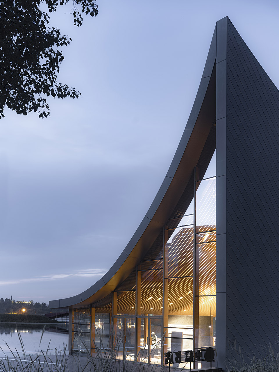 建筑表皮采用进口钛锌板,板面以平锁扣形式排布,形成独特的“鱼鳞形”肌理,与波光粼粼的水面相得益彰。钛锌板的建筑肌理,也呼应了川西传统坡屋顶建筑的“瓦屋面”形式。