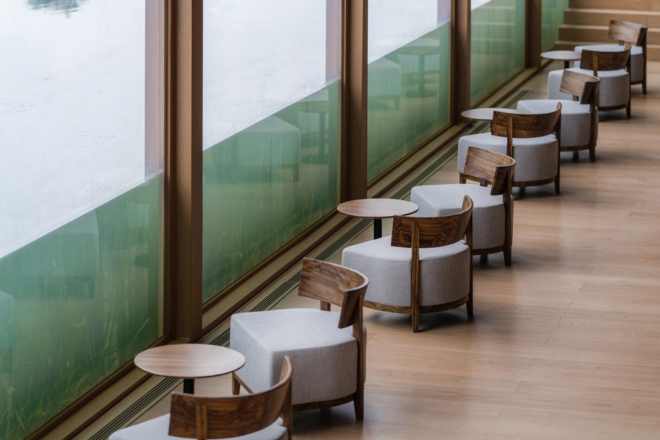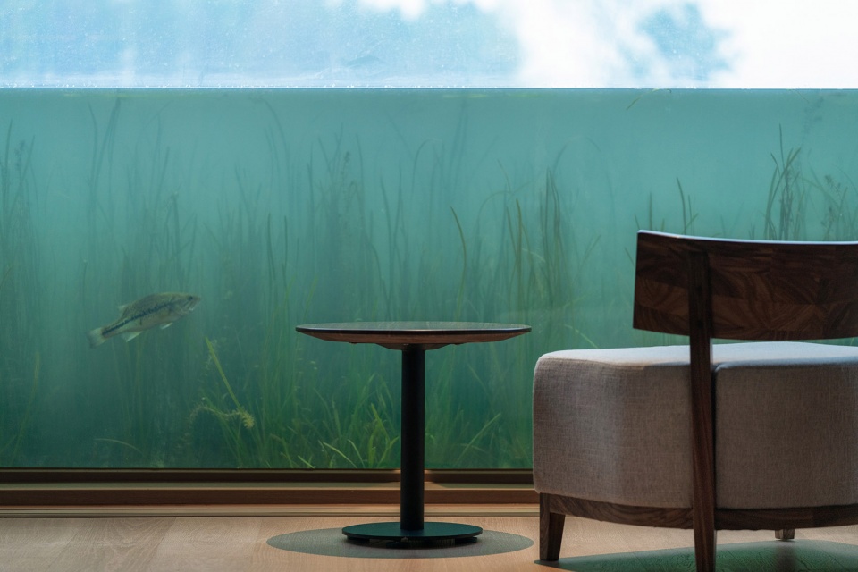 一排桌椅沿着玻璃幕墙摆开,构成咖啡阅读区。访客可就座于此处,在柔和的光影中,捕捉自然的瞬息万变,享受一切自然的馈赠。景观设计也为建筑正面的水下部分添加了水草藻类植物,游鱼时刻穿梭其中,与室内的使用者形成对望,产生互动,相映成趣。