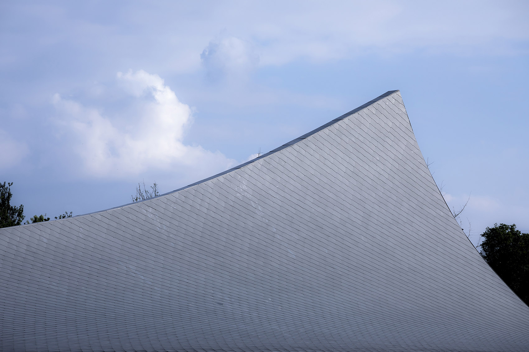 Titanium zinc panels imported from France are adopted for the architectural surface. Panels are installed by using the flat lock system to provide a fish scale texture and a visual connection with the shimmering lake. The texture of the titanium-zinc panels also corresponds to the traditional “tile roof” form.