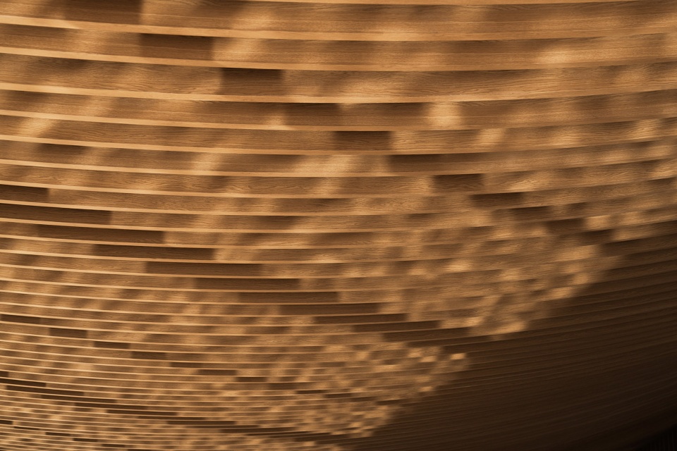 吊顶是由建筑屋顶双曲面延伸至室内的统一语言,采用整体双曲面格栅,由700余根不同曲率的木纹铝型材拼接而成,形成平滑的三维曲面。同时,为了实现干净纯粹的室内空间效果,所有的机械排烟管道、灯具电路系统皆隐藏于吊顶格栅与屋顶钢结构的夹层空腔中。室内整体效果以最简洁、纯粹的方式呈现,以木纹、混凝土肌理漆这两种材料作为空间底色,意在省去繁琐的装饰,为使用者带来更为舒适的视觉体验。