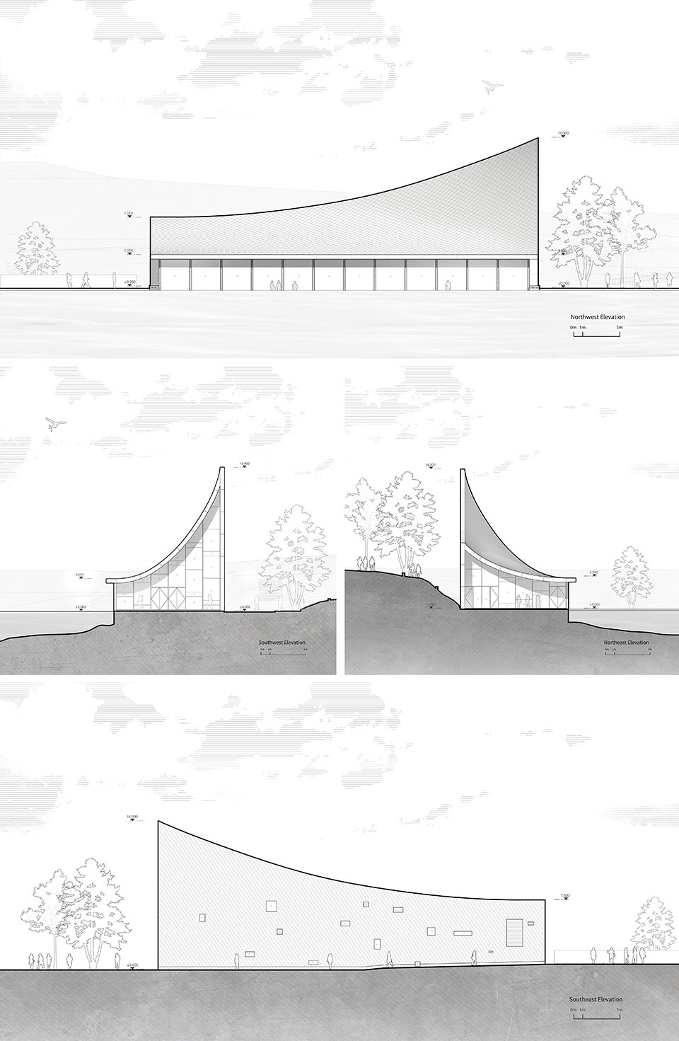 建筑屋顶最低点高度为3m,建筑东南角抬高至16m,东北角抬高至7.5m,形成了具有精神象征意义的屋顶。曲面坡屋顶造型也呼应了川西民居传统屋顶的建筑语汇。同时,屋顶的曲面与湖面的水纹形成恰到好处的呼应,微风吹过,湖面上荡漾着的涟漪,乘风延展至屋顶,形成轻盈的屋面,与兴隆湖公园的自然环境融为一体。建筑体以线性展开,顺应场地,使其得以与开阔的湖面相连。临湖侧玻璃幕墙延伸至水下,为室内下沉阅读空间引入柔和的水光,烘托出静谧、美好的空间情绪。
