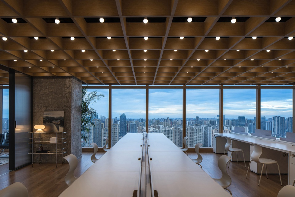 The main consideration for the spatial design was comfortability. To begin with, MUDA selected the wood color as the base and performed it with different materiality on the ceiling, floor and interior façade. At the same time, the white office tables revitalize the space; the bare concrete columns empower its sense of potency and time; the well-designed furniture system and flexible space divisions, compose a contemporary urban Shan-shui painting.