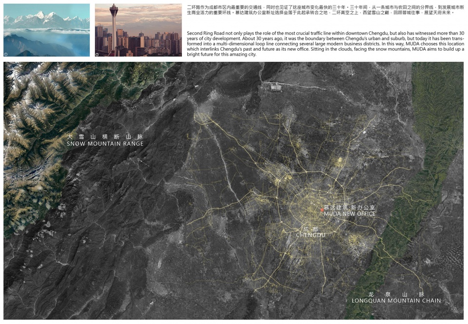 At the height of 160 meters and with a 270-degree view, MUDA new office-site is located at the 38th floor of Chengdu China Resources Building, right next to the eastern viaduct of the second ring road. When you look around, you can appreciate the gorgeousness of snow mountains on the west, and the well constructed city skyline and urban footprint. Meanwhile, when you look down, the combination of dynamic and static, modern and ancient, can all be found in the old neighborhood and the traffic streaming along the viaduct.