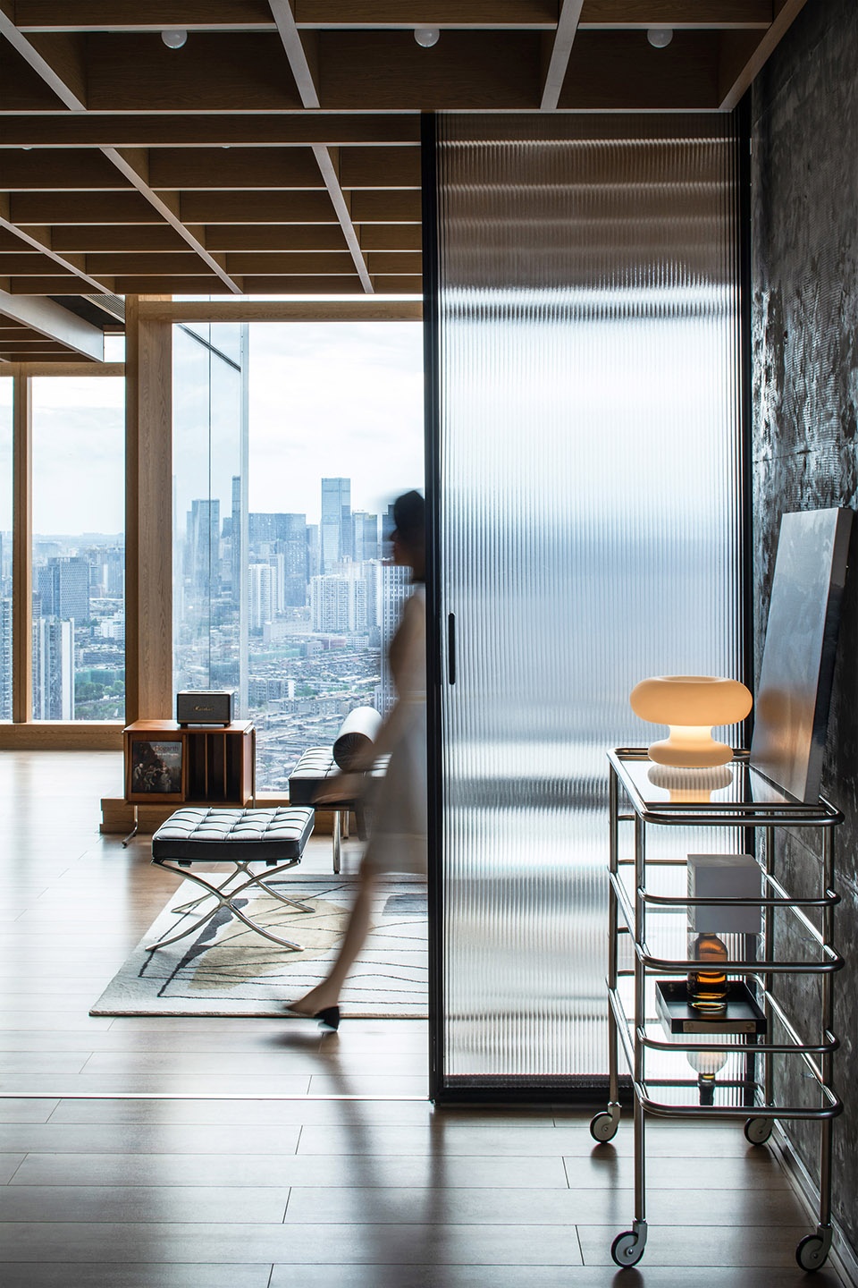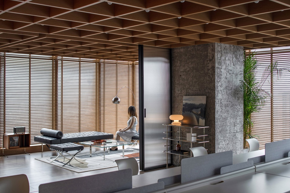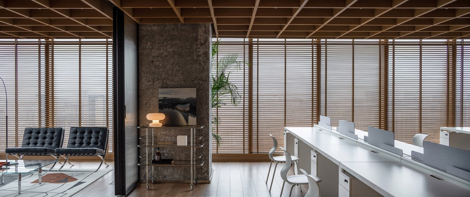 The office space has been divided into several functional dimensions, including entrance, individual office, standard working space, exhibition area, , bar, salon and multi-functional meeting area. Different spots of working area could obtain distinctive views of the city thanks to the open spatiality. Other than the views, the sliding division system provide flexibility for the meeting area and reception area. Besides, the electronic wooden louvers enable the spatiality freely transformed among close, semi-close/semi-open and open.