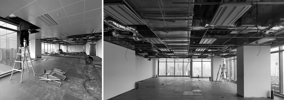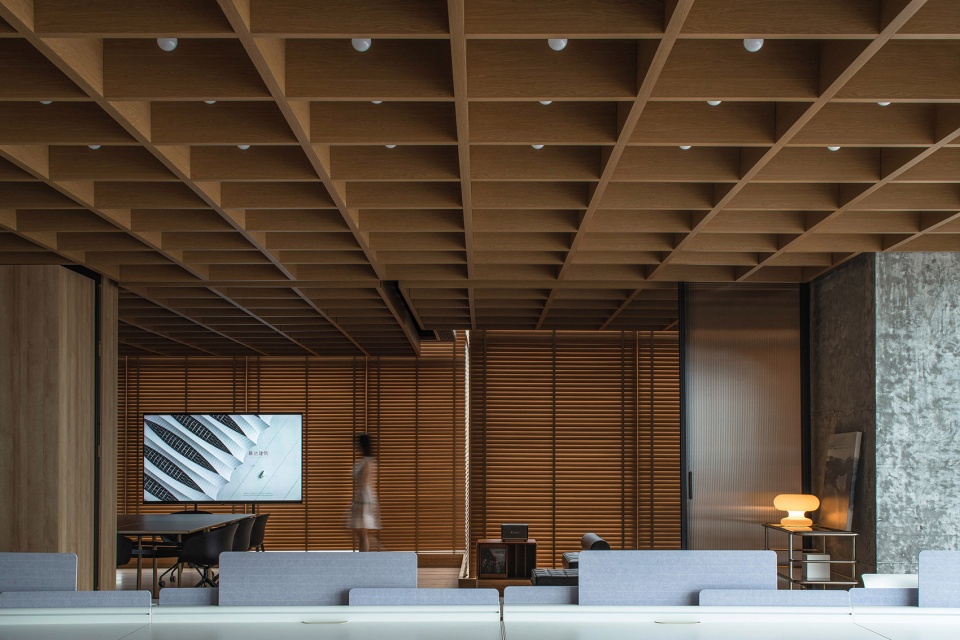 In the original condition, the mechanical equipments occupies almost 1m of the 4.2m floor height. To rebuild the order and invigorate the space, MUDA first removed all the standardized decoration of the office and then added the suspended ceiling with hollowed-out wooden texture grids. In this way, the primitive floor height was preserved, and a well-organized spatial texture was achieved..