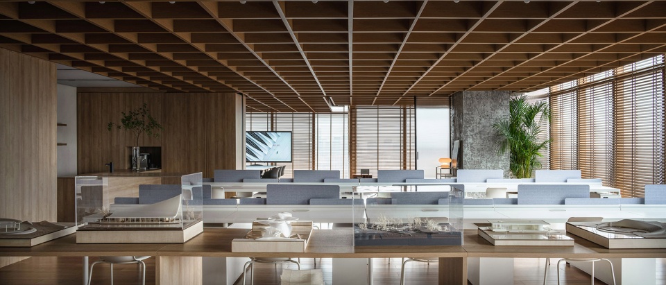 The wooden color serving as the main tone of the space, comes from the wooden suspended ceiling, wooden louvers, reinforced wooden flooring, and customized wooden cabinet etc. Moreover, the roughness of bare concrete and the delicacy of artistic paint composes a gentle melody with white table surfaces, translucent glass divisions, crafty architecture models, and moderate soft decorations.
