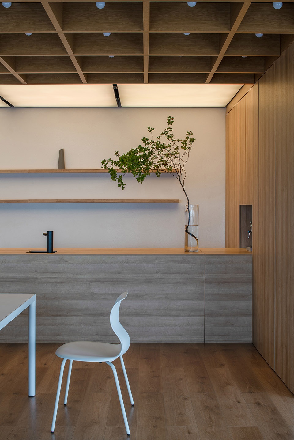 Following the principle of less is more, the harmony between sensibility and rationality was achieved by the design of material and function, which leads to a heart-warming, pure and tranquil atmosphere. When night falls, cold natural light smoothly transitions into warm interior light, while the translucent wooden louvers providing a sense of ambiguity. In this way, a poem about office space has been well-written.
