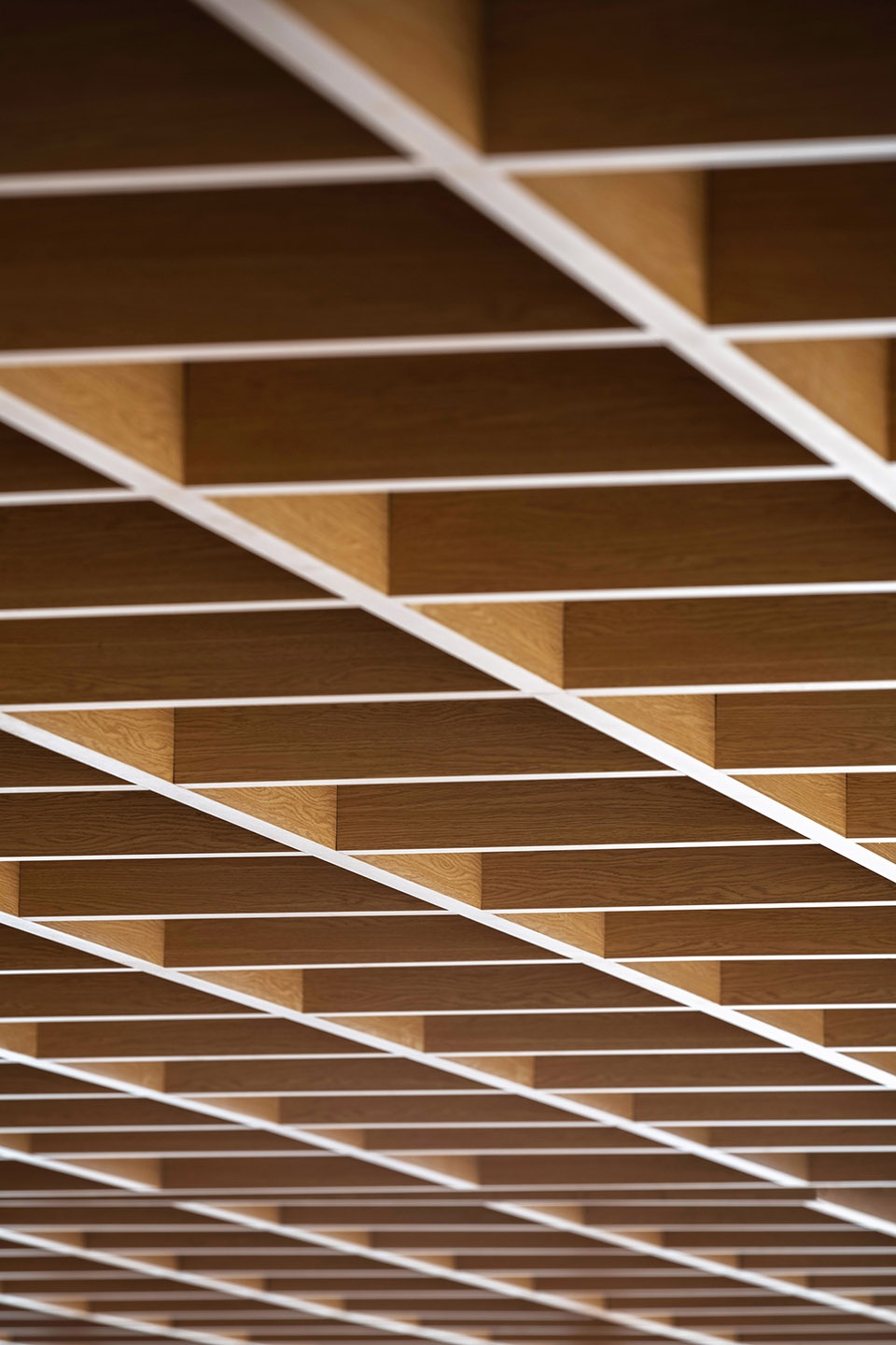 慕达建筑将写字楼原有的标准化装饰拆除,解构和重建空间的秩序。4.2米的建筑层高被设备层占用了近1米的空间,设计采用整体镂空的方格木纹吊顶,既保留了建筑原始层高,又形成了统一而有序的空间肌理。