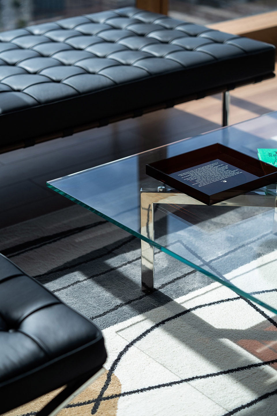 ▼ 长虹玻璃与木纹百叶; 玻璃、不锈钢与黑色皮革,Curved glass and wooden louvers; Glass, stainless steel and black leather