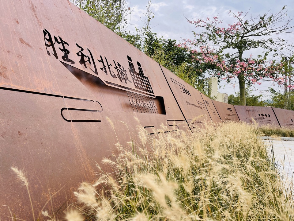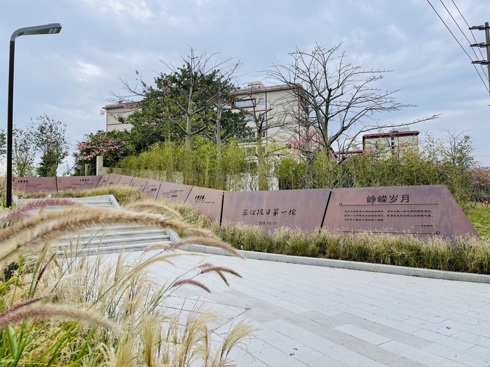 As the opening of the Kwai Chung River, the scenic wall of the first Anti Japanese gun in Dongjiang tells the extraordinary years of the establishment of the Dongjiang column. The East longitudinal time view wall is 37m long and 1.6m high. The five blocks of linear rusted iron exhibition boards are displayed in pictures and texts with five contents: preface, coastal mobile drama troupe, baguang Township Anti Japanese self defense force, the establishment of Dapeng Peninsula party organization and the first shot of Dongjiang Anti Japanese war.