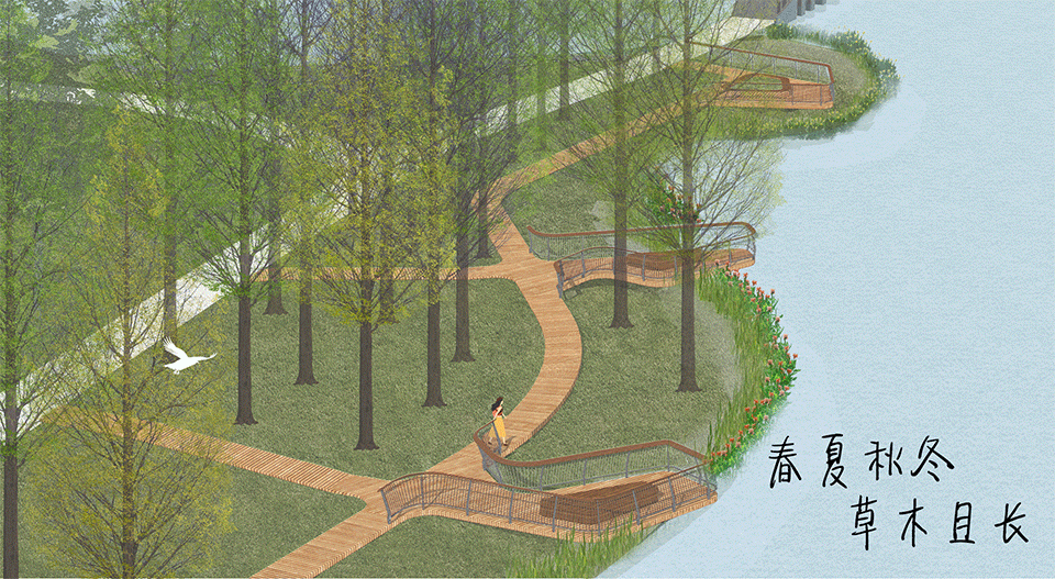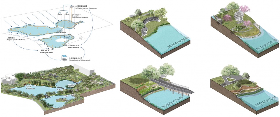 葱郁的植被柔化水陆边界,让更多的生物群落得以安家落户。路径化的导流系统与梯田式植物过滤系统让地表径流得以净化,流入湖区的水质得到保障。水体循环的管网与梯田式水位布局有效控制内源污染与水质,增强水活性。
