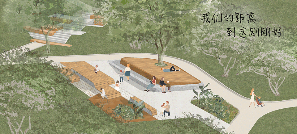 从形态设计回归关系设计,服务能力的多元化弹性化,让人们可以自己选择交互距离的空间场所,夕阳的辉影让城市穿过湖面变成远焦的氤氲,晨间林下的雾气让自然离我只有几步的距离,日常的尺度消纳在林间的活动场地。