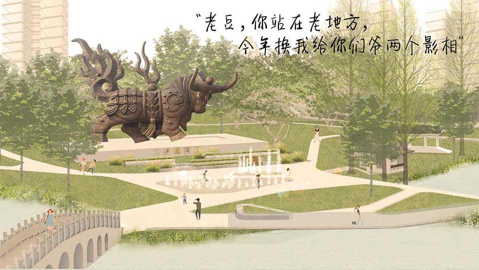 30米高的大型艺术雕塑盖世金牛是我国当代美术艺术家韩美林为纪念深圳的拓荒牛精神设计的。这是四海公园最核心的情感记忆点,也是深圳很宝贵的城市风貌里的人文要素。把城市的片段与生活片段以蒙太奇的手法重新组织在同一场景下,盖世金牛与城市背景共筑天际线,用更安全的方式重塑儿时池塘田野边嬉戏的场景。过去的故事、现在的城市与当下的生活在叠合中重现时间的流动。