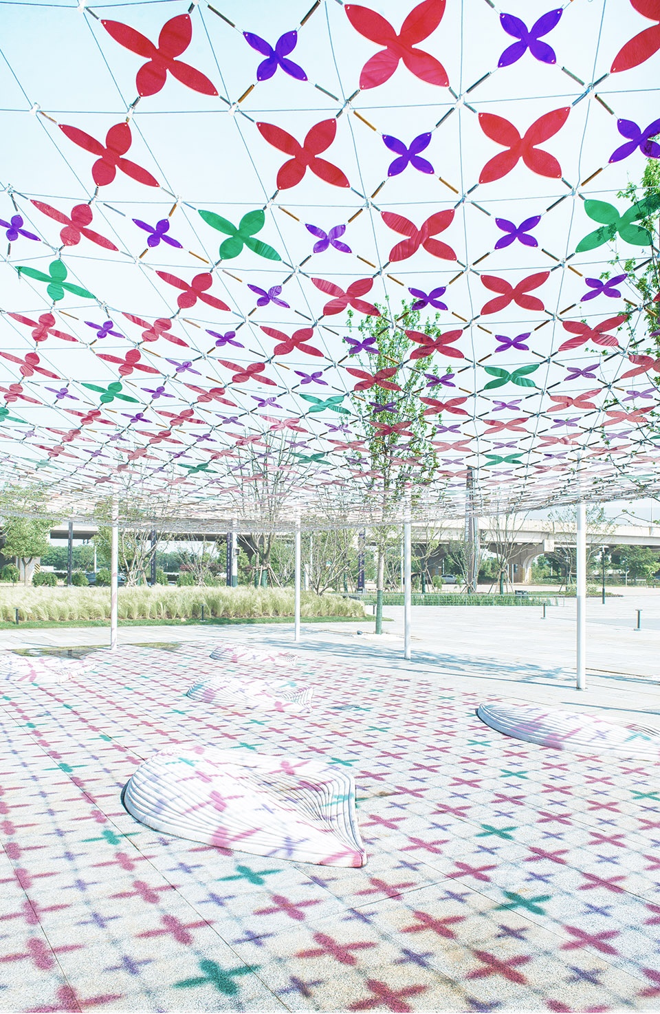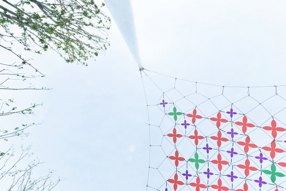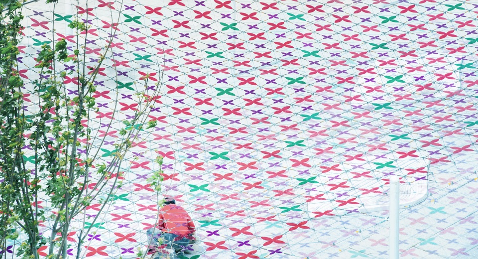 ▼从上方看景观装置,彩网采用蝴蝶造型的花纹