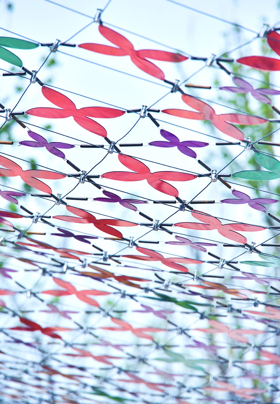 ▼景观装置局部,五彩的蝴蝶花纹被固定在透明的网上