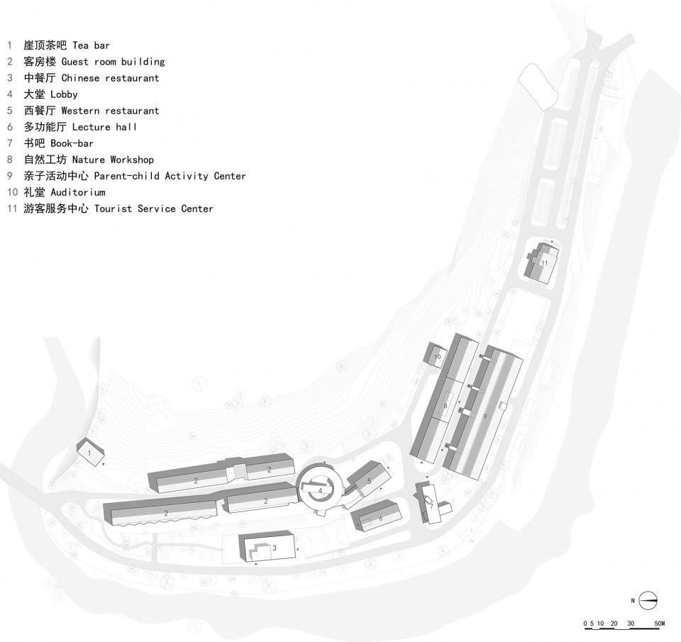 The design starts from the site planning, considers the integration of architecture, interior, landscape and lighting, retains the industrial characteristics and historical information of the original building to the maximum extent, and carries out transformation and reuse. First of all, the design protected the industrial heritages and preserved the original appearance of the buildings through structural reinforcement and other measures. After that, the original building spaces were selectively used to implant new functions, incl. changing the original dormitory into hotel rooms, the original boiler-house into auditorium, the original office building and equipment rooms into restaurant, reception center, etc. On this basis, new public buildings are set up at important nodes of the site to form space and visual anchor points, such as hotel lobby, book bar at the entrance of the area, tea bar at the top of the cliff, and so on. The new building and the old building are deliberately distinguished in form and material, forming a dramatic dialogue relationship, and clearly indicating the spatial characteristics and architectural language of the two different historical stages.