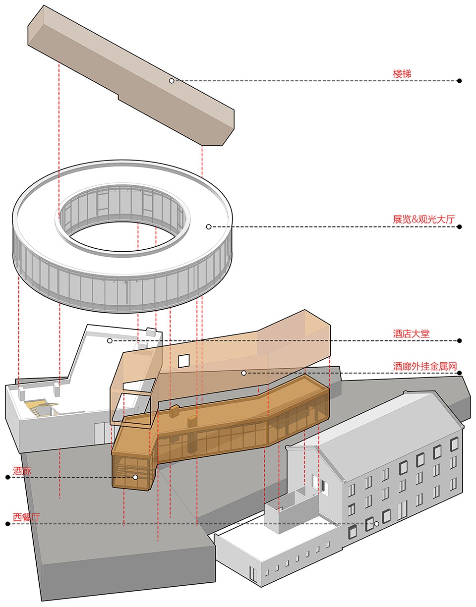 酒店大堂是新建,它位于四栋客房建筑与西餐厅中间,起到了公共区域和私密区域阻隔和转换的作用。建筑分为两层,由四个建筑体块互相穿插构成。首层为酒店大堂,包含前台,休息等待区等功能,通过橙色的酒廊,大堂空间与西餐厅的三层相连。二层则是环形展厅,可以举办活动和展览。从一层到二层除了可以走室内楼梯,也可以使用室外的大阶梯。