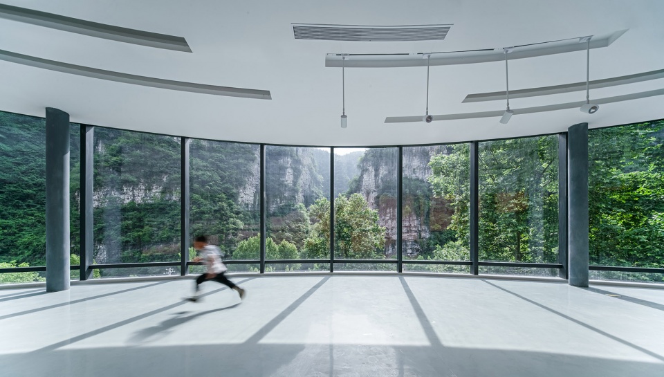 In order to realize the special form of lobby architecture, architects and structural engineers have made great efforts. The whole building is of steel structure. In order to get a transparent circular exhibition gallery as much as possible and ensure the indoor comfort of the first floor building, the circular exhibition hall is supported by three groups of giant steel columns, which are arranged at 120 degrees, hidden in the service-oriented space and the lounge space of the lobby respectively, and cannot be detected from the outside. The circular exhibition hall is supported by 9 sets of steel columns, which is placed on the first floor like a circular “box”. The oblique large ladder and the tube surrounding it are like a huge square column which is inserted in the ring obliquely, playing a traffic connection of different elevations. The four building blocks seem to rely on each other for stacking, but in fact, the structure is independent and self-contained, which ensures the safety of the building structure. The complex height difference, uncertain geological conditions (karst landform), the avoidance of the adjacent old building foundation and the reservation of the original trees in the site all brought great challenges to the project implementation process. Architects, structural engineers and construction units faced and overcome these problems one by one, and finally completed the construction and expression of the complex building shape.