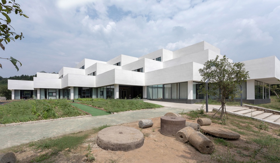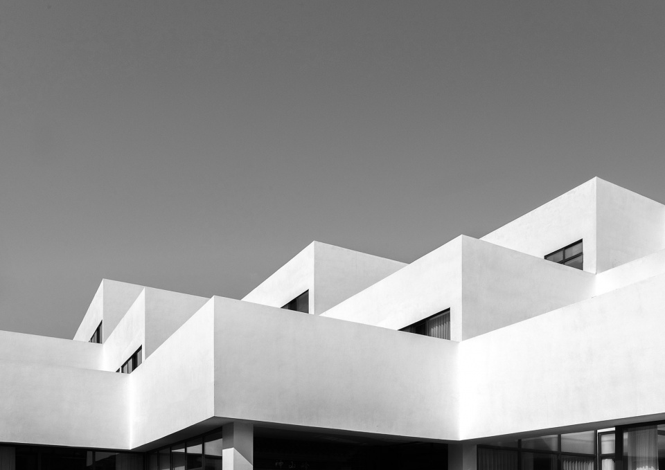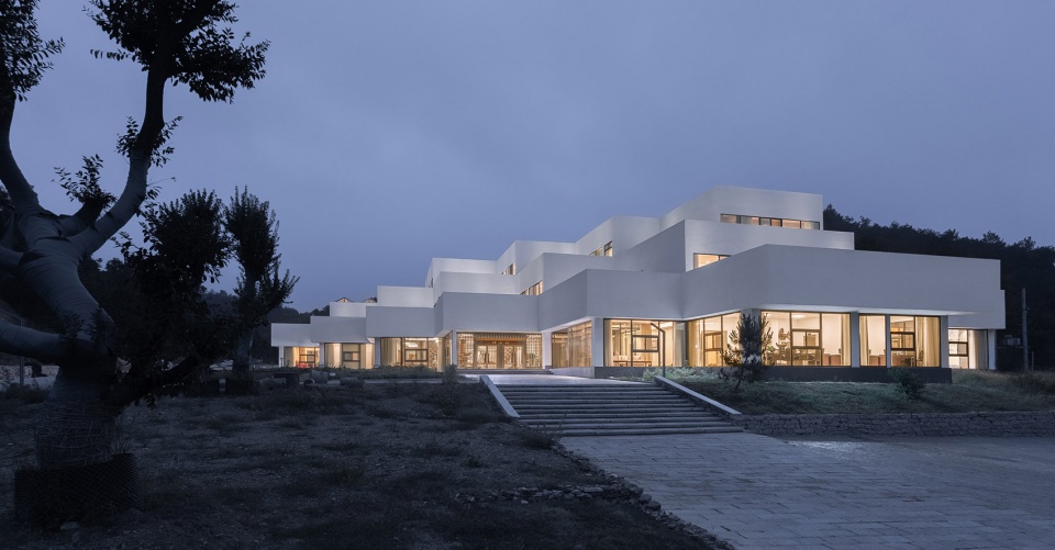 The outer walls of the building are all white, which is the intention of the design team to weaken the decorative language on the walls regarding both material and color while strengthening the geometric and constructive characteristics of the architecture. In regard to the processing of the building elevation, horizontal lines and solid bodies are emphasized, while successive and concrete white bands take shape through roof parapets and downward cornices. However, the design pays more attention to detailed varieties, as well, in addition to the sense of order. For example, the courtyard to the east side of the entrance forms a small scenery for the interior space, viewed from three perspectives, and the skylight ceiling of the banquet hall provides the inner space with natural lighting while arousing partial variation of the architectural form.