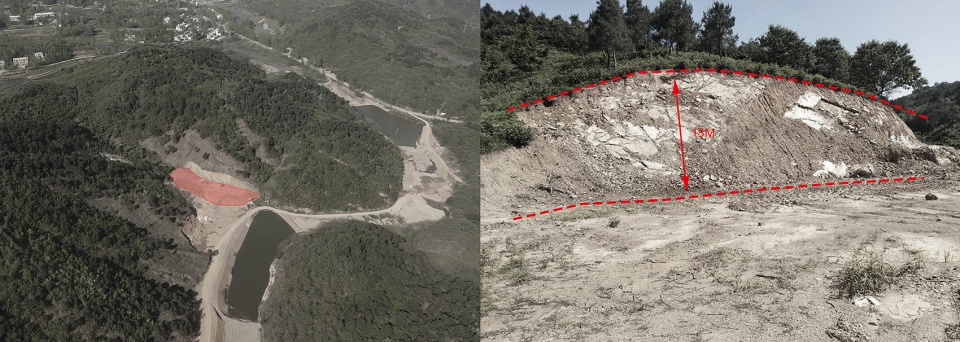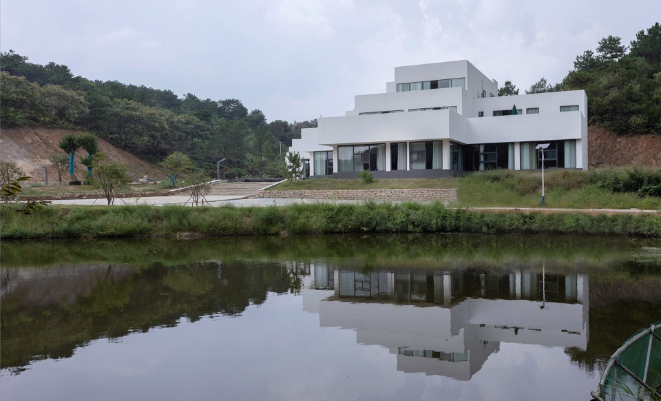 The architectural design concept is based on the reading of the project site, which is located at the intersection of the east-west main road and a northward road. It presents the form of an irregular triangle, which is narrower in the north and wider in the south, with hills to the northwest and –east, but relatively flat and open land to the southwest, where a better opposite scenery is to be found. Before the introduction of the architectural design team, the proprietor has had the site formatted and expanded, the hill to the northeast excavated, which has changed the original environment to a certain extent. Faced with the exposed side slope of a 15-meter height, the design team made a proposal to concede the building from the center to the border of the site, connected to the excavated hill, which not only creates outdoor spaces, but also makes the building an extension of the natural massif, constituting a fundamental arrangement that the building backs onto the mountains in the northeast and faces the waters in the southwest, according with the traditional Chinese Feng-Shui principles.