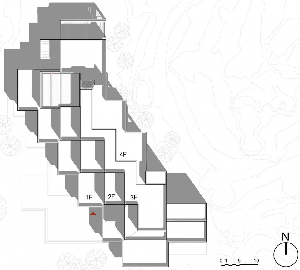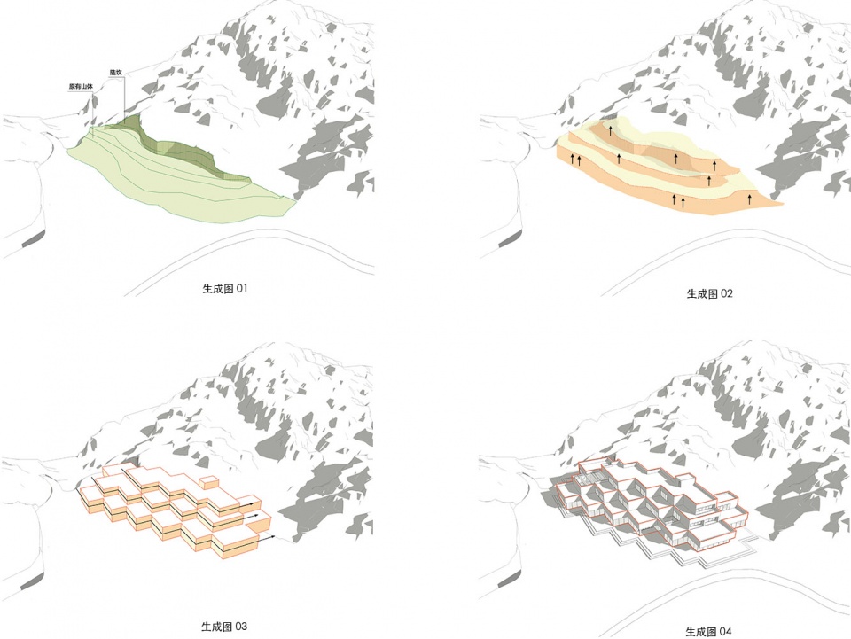 在此基础上,设计团队提出“折叠的水平线”的设计理念:建筑总体呈退台式组织,暗示了建筑作为另类等高线与山体的关系,建筑作为自然环境的一种延续,但又不仅限于对自然的模仿和拟态。