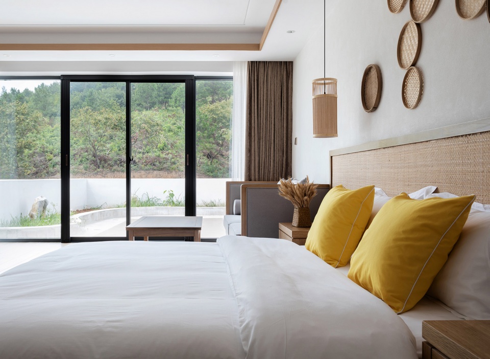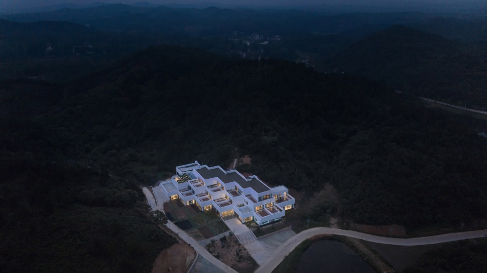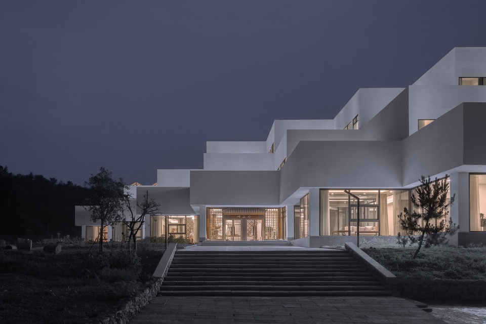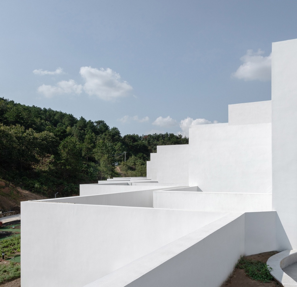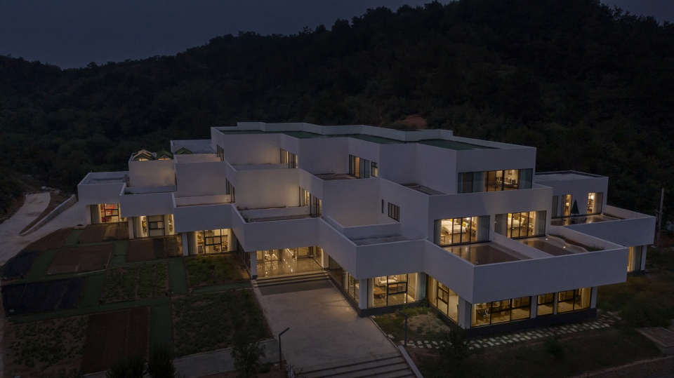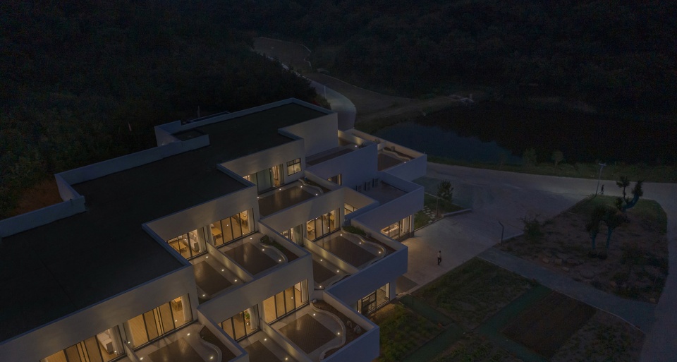 The building consists of three storeys: 1st floor, L-planned, as public service area, with reception hall, agricultural products sales center, dining hall, banquet hall, meeting hall and offices; 2nd and 3rd floors as accommodation area, with 22 guest rooms in total. The design team chooses the “stepped construction in set-back mode” as the basic architectural form: The roof of the lower floor serves as the upper room’s outdoor terrace, so that each guest room is endowed with its independent “hanging garden”, which enriches the accommodation experience. As for the guest rooms, through scattered stacking up of the modularized function units like toy bricks, a rhythmical spatial sequence is takes shape, which, meanwhile, maximizes the viewing sides to the west and the south. At the same time, the traffic organization and the para-position of the pipelines with the structure must be guaranteed, to ensure the realization of the architecture in rural context. As for the outdoor set-back terraces, the design team deliberately stagger them on each floor plan, in order to match the protruding corners of the upper architectural contour with the concave corners of the lower one, in which way a relatively individual outdoor space for activities is formed on the same floor plan and the privacy of the guests is protected.