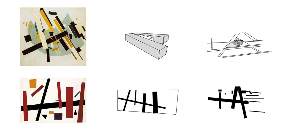 ▼引用马列维奇抽象画中几何体交错叠加的组合方式,interwoven and superposed geometric objects of Malevich’s abstract art