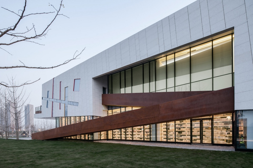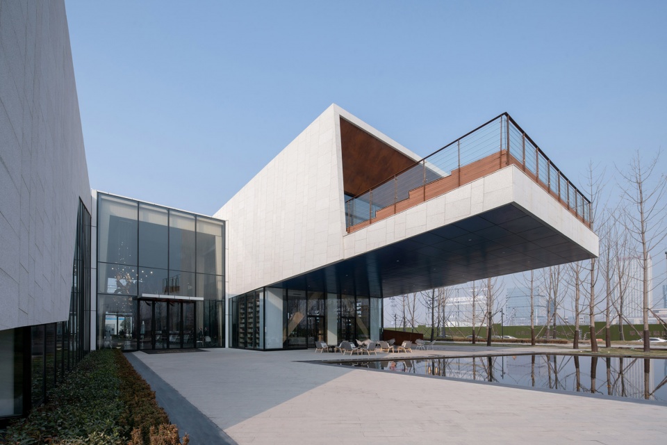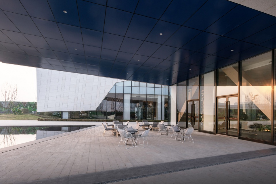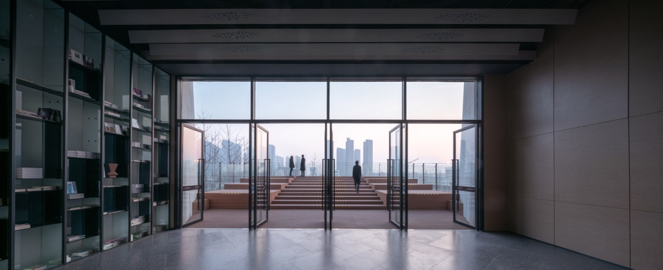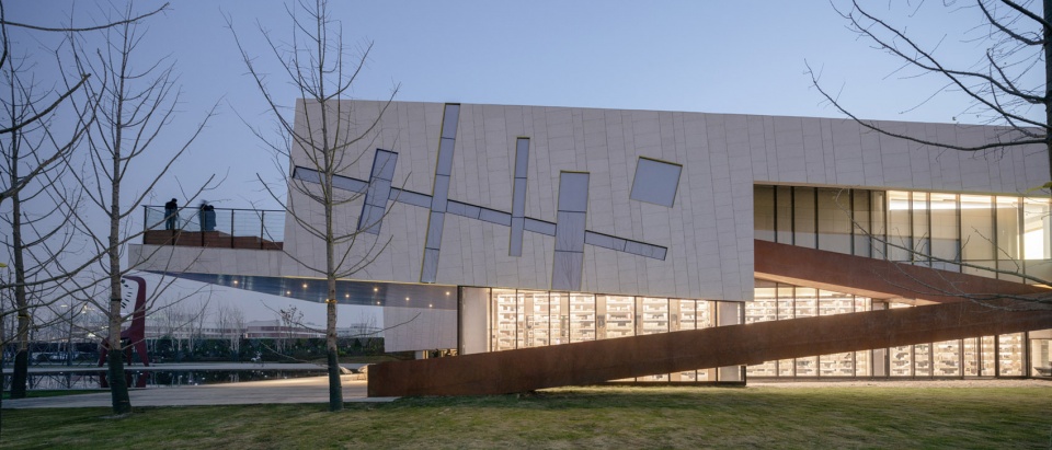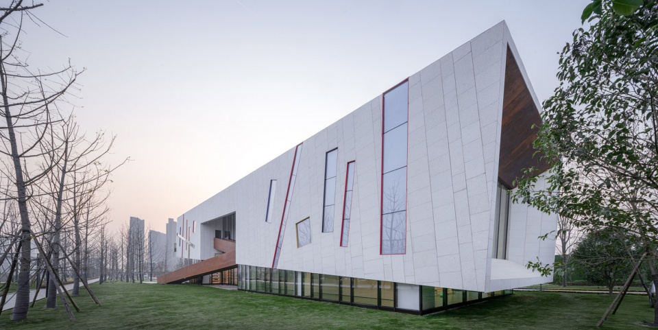 At the eastern main entrance, the large terrace of the northern block and the water beneath it make up a layered and orderly space. The reddish brown zigzag-shaped slope leads people to the second floor, which adds interest to the space and enriches the façade.