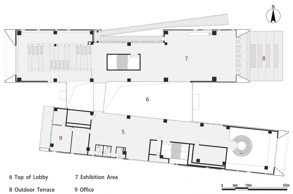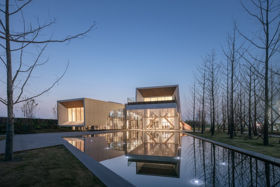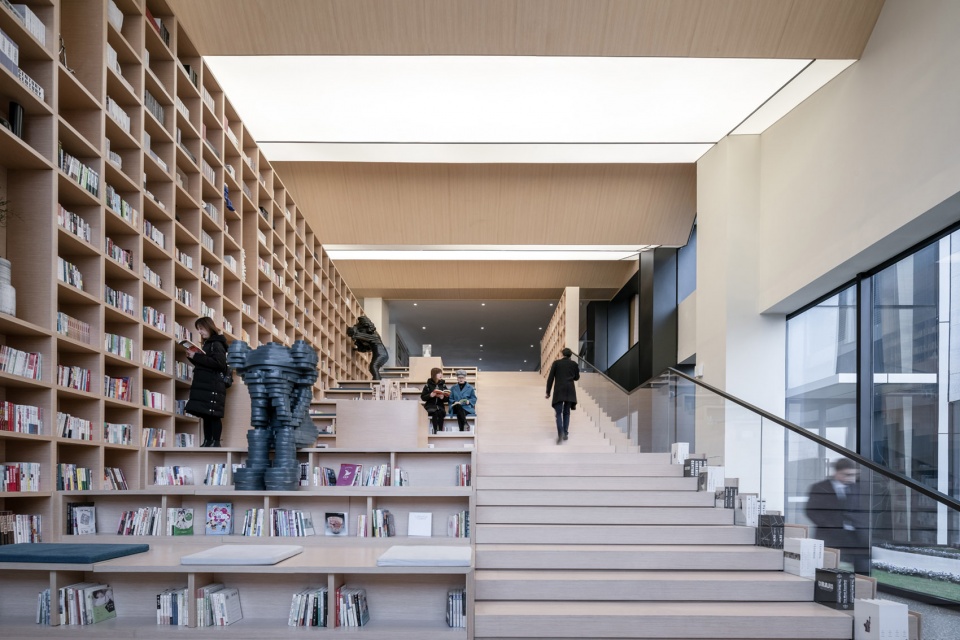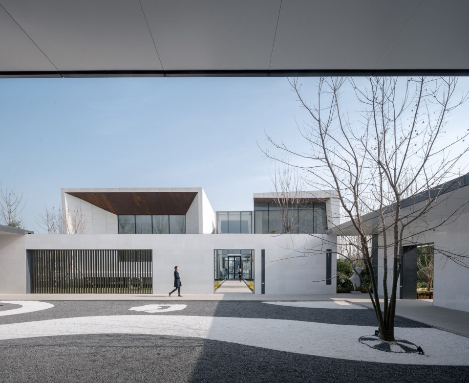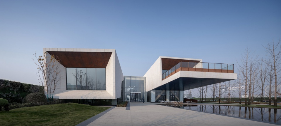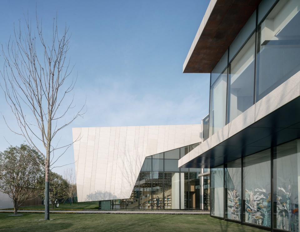 At the eastern main entrance, the large terrace of the northern block and the water beneath it make up a layered and orderly space. The reddish brown zigzag-shaped slope leads people to the second floor, which adds interest to the space and enriches the façade.