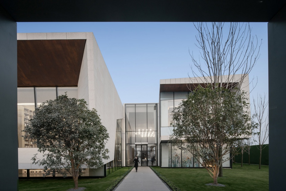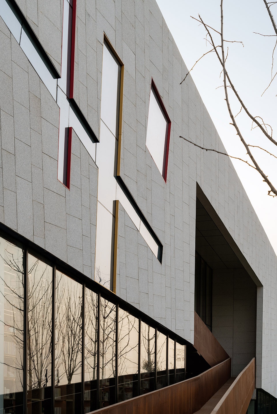 The façade features virtual-real combination. That is, “virtual” glass is combined with “real” white granite. The façade design continues to adopt Malevich’s abstract art by using white granite as the “drawing board” and glass window as the “geometry” , and partial geometry extends to the roof. The window frame is decorated in three colors (red, yellow and blue) to present a three-dimensional abstract painting of “suprematism”.