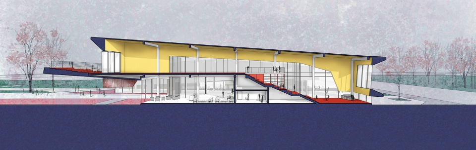 引用马列维奇抽象画中几何体交错叠加的组合方式以及长方形场地限制,最终形成以三个基本长方形交错叠加组合的形体舒展地坐落在场地中。南北向三个大小不同、交错布置的体块打破了场地的狭长感。中间体块为建筑的主入口部分,位于南北两个长方形体块偏居中的位置减少空间狭长感,增强建筑的功能性。