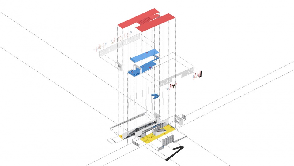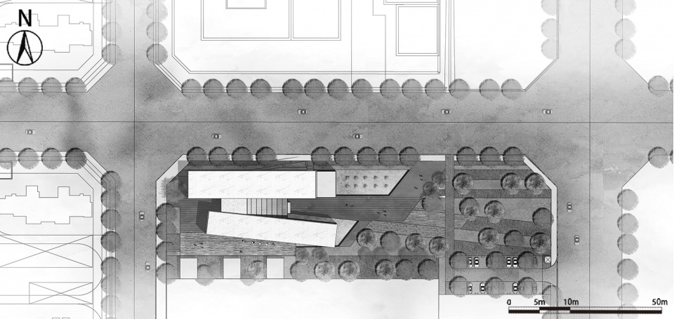 Interwoven and superposed geometric objects of Malevich’s abstract art are used along with the rectangular site to become a form consisting of three interwoven and superposed rectangles, which lies snugly at the site. Standing in north-south direction, the three blocks in different sizes and interwoven arrangement make the site look less narrow. The block in the middle is the main entrance of the building, and the two rectangular blocks in the south and north are arranged near the middle position to make the space look wider and enhance the functionality of the building.