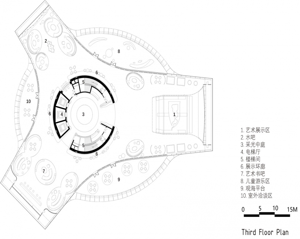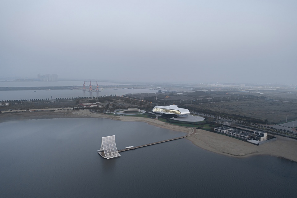 The entire exhibition area is designed with three major functional areas: the Wave (art museum), outdoor theater and public space. Each area is connected with surrounding beach. The building is separated from the sand dune and reef, looking like a floating space structure above the sea.