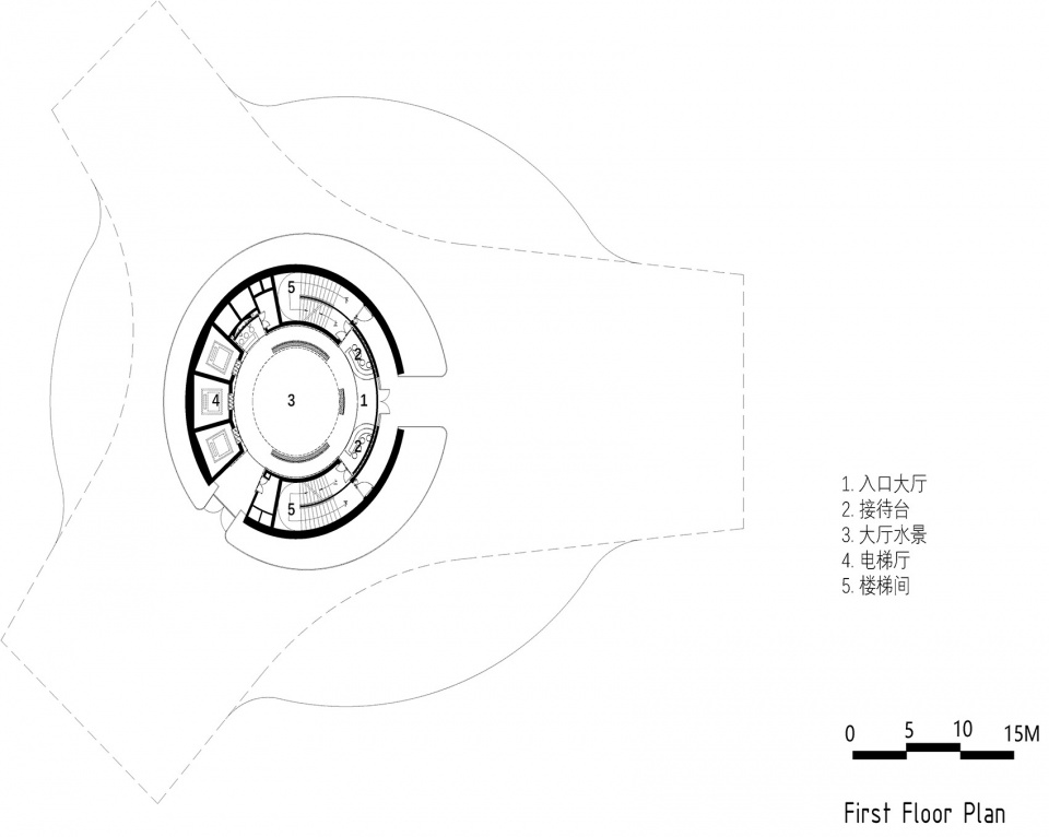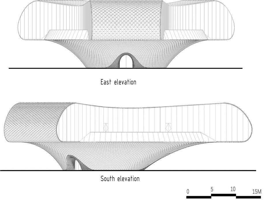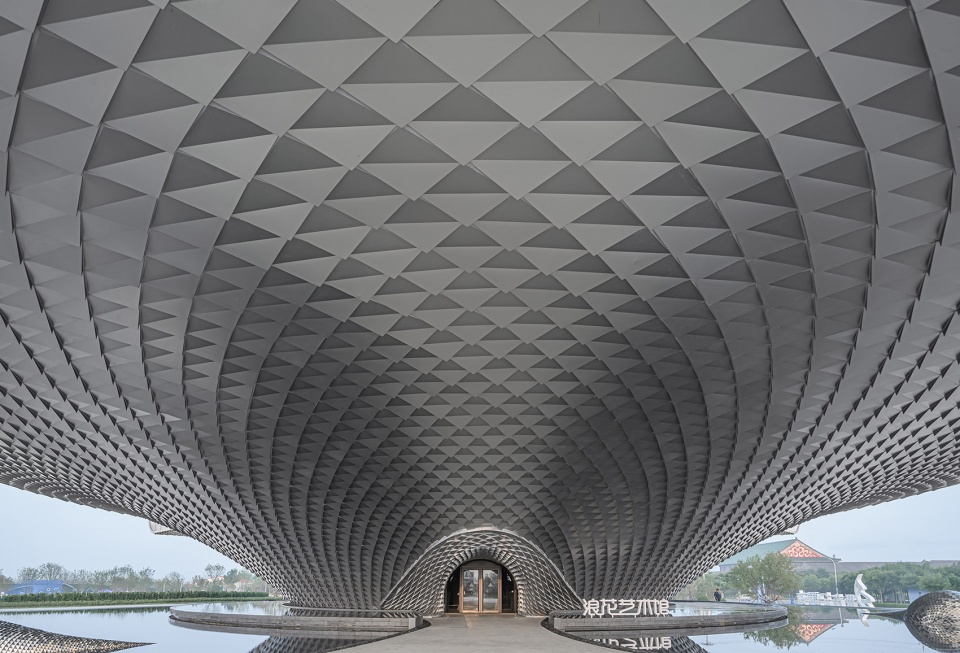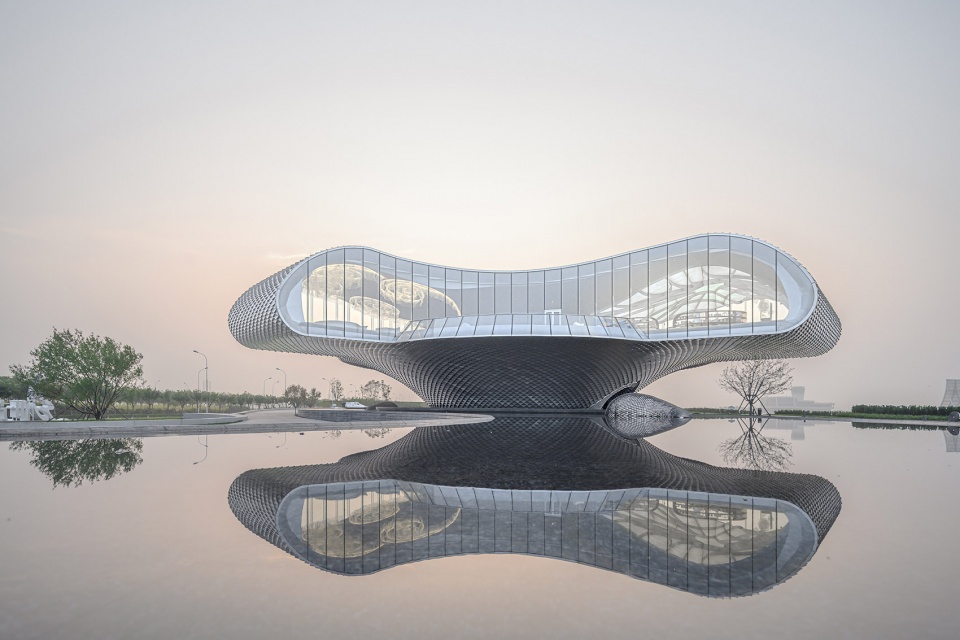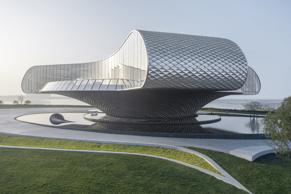 An integrated parametric design is used for the skin of the building. The subtle arrangement of the scale-shaped aluminum plate allows the façade to reflect the sunlight from different angles in different periods of time. The pool around the building casts diffuse light onto the scale-shaped façade to produce a gorgeous look. The column-free space of the 30-plus-meter tall building is achieved by the thin shell structure, as it goes upwards to split into three sections that balance the stress in each direction.