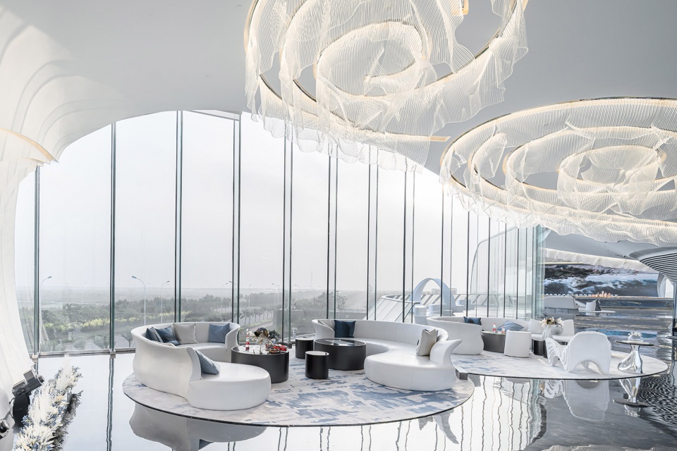 The entire bay area planning follows the basic logic of “point, line and plane to create contemporary urban spatial sequence of man, sea and sky”. Inspired by the idea of wave, the building focuses on the theme of “water”, extracts the concept of “water drop and wave” from waves and creates an image on the sea. The whole building resembles the wave to create a dialogue between the building and nature, and the building has become a symbolic existence where the sea and the earth converge.