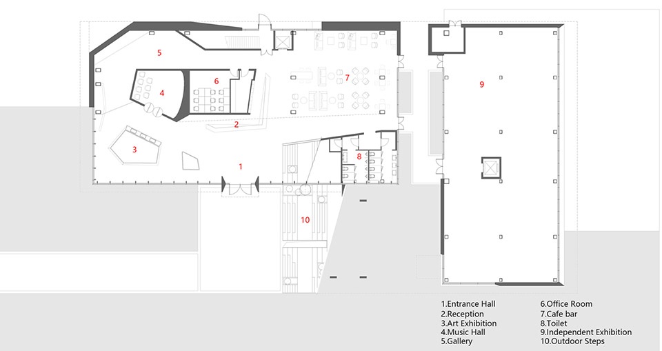 Strive for the unity of structure, space and form throughout the whole process of the project. The main space is a steel structure columnless flow space. The roof appears in the form of torsional alienation, with skylight scattered on the side. The outdoor large steps extend indoors. They cycle, look at each other and blend with the architectural form.
