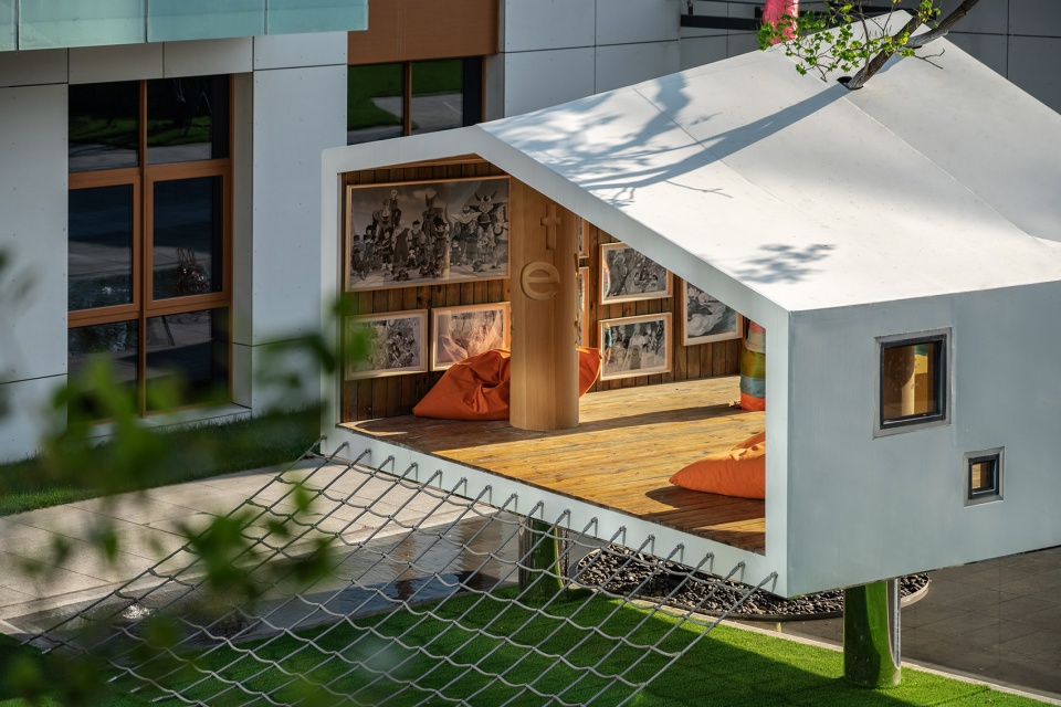 viewing the kindergarten from the inner courtyard, arranging a white tree house in the central inner courtyard