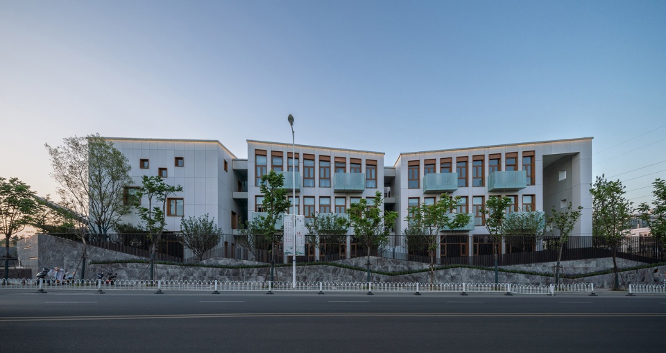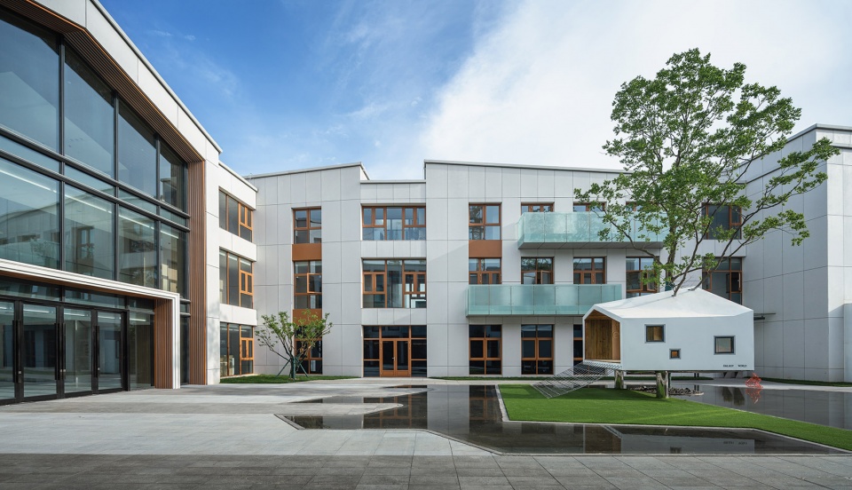The two urban interfaces are three boxes, and the skyline and wall line are presented in the form of folded plate, which adds a playful look into changes. Besides, not much emphasis is put on architectural feature of a kindergarten, but many white elements and some wood-colored ones are used to deliver a natural, modern and simple atmosphere. Light grey rock panel is chosen, as lightweight and eco-friendly panel can achieve consistent modulus for doors and windows. A balcony is added to the southern part and inner courtyard; ground glass looks hazy as the sunshine varies from time to time.