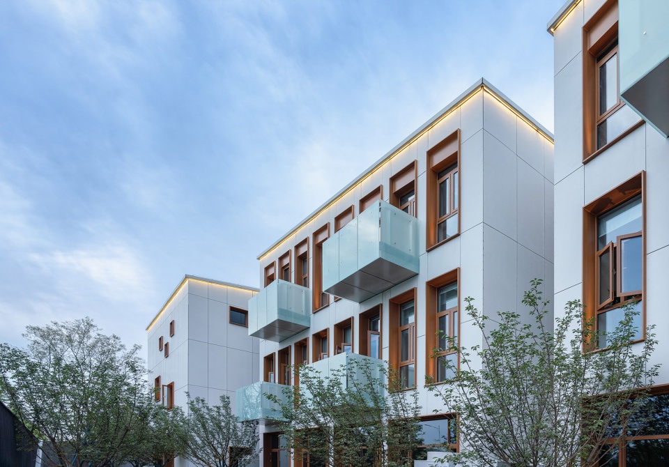 ▼幼儿园的沿街立面局部,色彩上采用大面的白色和少量的木色,设置由磨砂玻璃打造而成的阳台