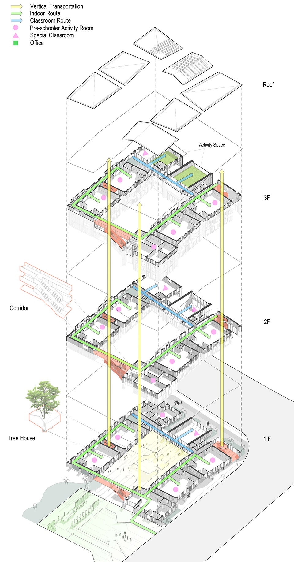 幼儿园设计中采用U型平面布局,由7个的错落有致“容器”组合而成,每个容器作为童真部落的生活空间,不同主题空间和公共活动区域串联起来的“容器”将内外院空间限定出来。十二个班级,构成了一个城市的小型微缩部落,我们希望在这个专属于儿童的空间部落当中,能够营造出一个可以由孩子们自己主宰,接触自然,无限探索的游乐空间,在无形的欢乐当中健康自由地成长。而这个专属的童真部落正是建筑师想象成为天真烂漫的孩童,从孩子的角度出发,考虑孩子爱玩的天性,送给城市的一份礼物。