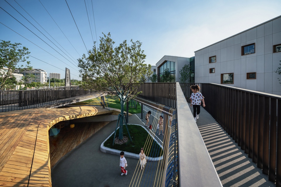 穿过中心的建筑,这里便是孩子们的专属乐园。利用场地与道路的高差,将折板的建筑屋顶形式运用到沿街市政绿化空间中,巧妙形成非传统形式的围墙。奔跑、攀爬、躲藏,儿童的乐园不是限定他们的行为,而是释放他们的天性。屋顶室外活动场地是乐园在空间上的延伸,天窗提供充足自然光的同时,让小尺度的“天空之城”激发孩子们的好奇心和想象力。