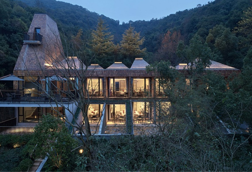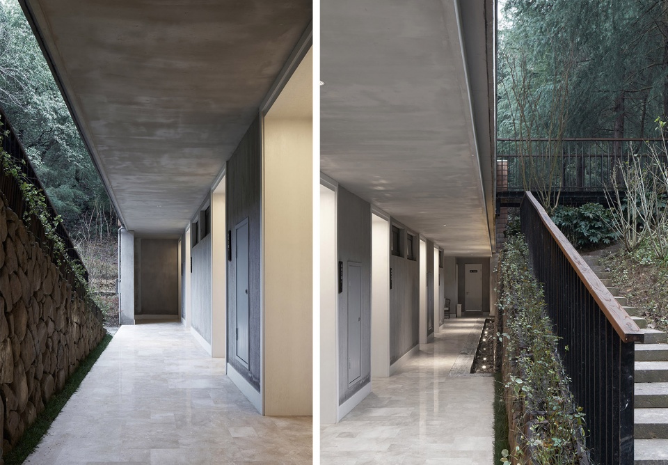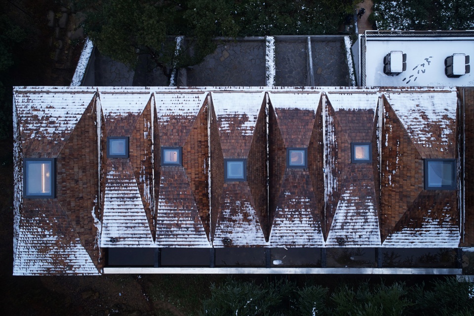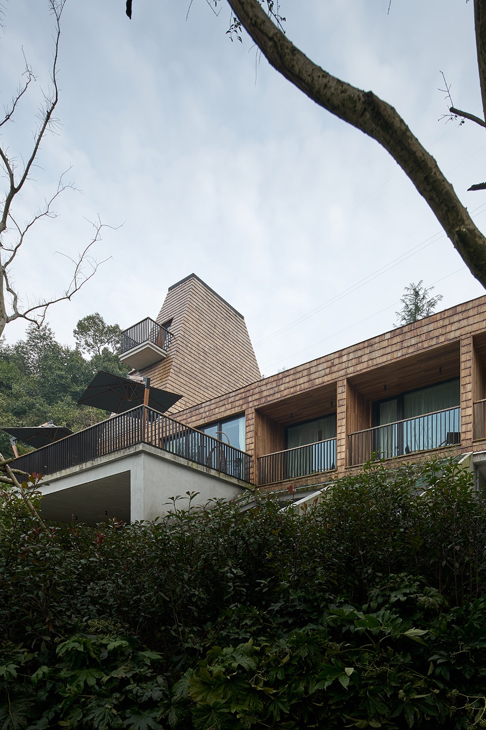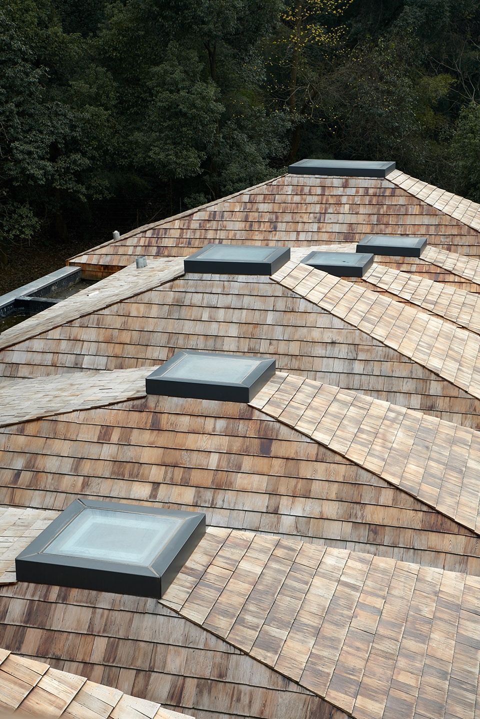 The architectural style presents a contrasting state: the first floor adopts conventional cements and limes mixed with some straws, making it plain and heavy as the background of tea gar-den; in contrast with the first floor, the second is decorated with woodcontrasts, floating in the air. The slightly random top of the four slopes of varied heights that forma changing sky-line echoes in harmony with the row of pines in the rear. The big tree in middle of the site seems to grow out of the building, which is again consistent with the site’s characteristics: protect the ecology, get rooted tea gardens and ablaze with pines.