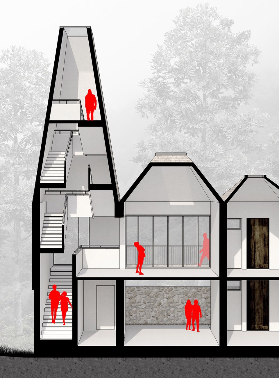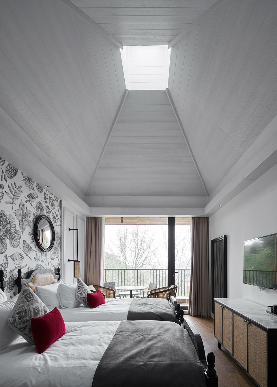 茶园植根于大地,松树耸立与蓝天,建筑便坐落在两者之间,成为茶园的背景,也与松树成为伙伴。建筑最终设计成两层的度假小楼,一楼强调与茶园的联系,每个房间设置花园,花园之间用斜墙分割,墙体远端深入大地,与茶园融合。二楼则强调与松树为伴,能够俯视茶园,远眺乐园。由于体量较大,每层6个房间,共有12间客房,便是在二楼设置了公共活动厅和室外露台作为共享空间。出于一开始就有登高望远的想法,顺着公共客厅继续向上爬两层高度做个瞭望台,期望成为整个山谷的制高点,俯瞰整个主题乐园。地处相对幽静的区位和功能属性,非常适合公司团建和同学聚会等用途。